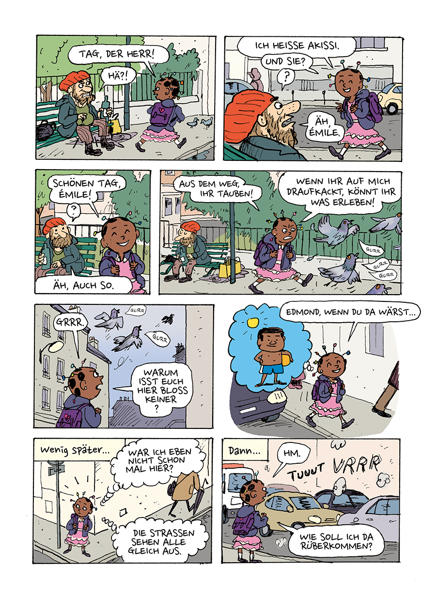 Soeben ist Akissi in Paris gelandet - sie ist nun zwölf Jahre alt und beginnt das neue Schuljahr an einem Pariser Gymnasium, weit entfernt von Bubu, ihren Freunden und der Familie. Ganz allein in der Ferne ist sie allerdings nicht: Ihr Bruder Fofana ist (eher unfreiwillig) mit von der Partie, und beide wohnen sie bei ihrem Großonkel Papi. Ein neues Land, neue Regeln, neue Freunde - die Integration ist alles andere als einfach... Warum reagieren die Leute auf der Straße zum Beispiel nicht, wenn Akissi sie anspricht? Zum Glück gibt es den Obdachlosen Émile oder die Dame in der Kantine...Wie ihre kleine Heldin Akissi verließ auch die Autorin Marguerite Abouet mit zwölf Jahren die Elfenbeinküste und ging nach Paris. Mit ihren Serien AYA AUS YOPOUGON und AKISSI versucht sie, ein Afrika frei von Klischees darzustellen.