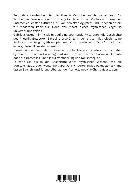 Seit Jahrtausenden fasziniert der Phoenix Menschen auf der ganzen Welt. Als Symbol der Erneuerung und Hoffnung taucht er in den Mythen und Legenden unterschiedlichster Kulturen auf - von den alten Ägyptern und Griechen bis hin zur modernen Popkultur. Doch was macht diesen mythischen Vogel so universell und zeitlos?Gabriela Falkner nimmt Sie mit auf eine spannende Reise durch die Geschichte des Phoenix. Entdecken Sie seine Ursprünge in der antiken Mythologie, seine Bedeutung in Religion, Philosophie und Kunst sowie seine Transformation zu einer globalen Ikone der Popkultur.Dieses Buch ist mehr als nur eine historische Analyse: Es beleuchtet die tiefen Symbole von Tod und Wiedergeburt und zeigt, warum der Phoenix auch heute noch ein kraftvolles Sinnbild für Veränderung und Neuanfang ist.Tauchen Sie ein in die Geschichte eines mythischen Wesens, das die Vorstellungskraft der Menschheit über Jahrhunderte hinweg beflügelt hat - und lassen Sie sich inspirieren, selbst aus der Asche zu neuen Höhen aufzusteigen.