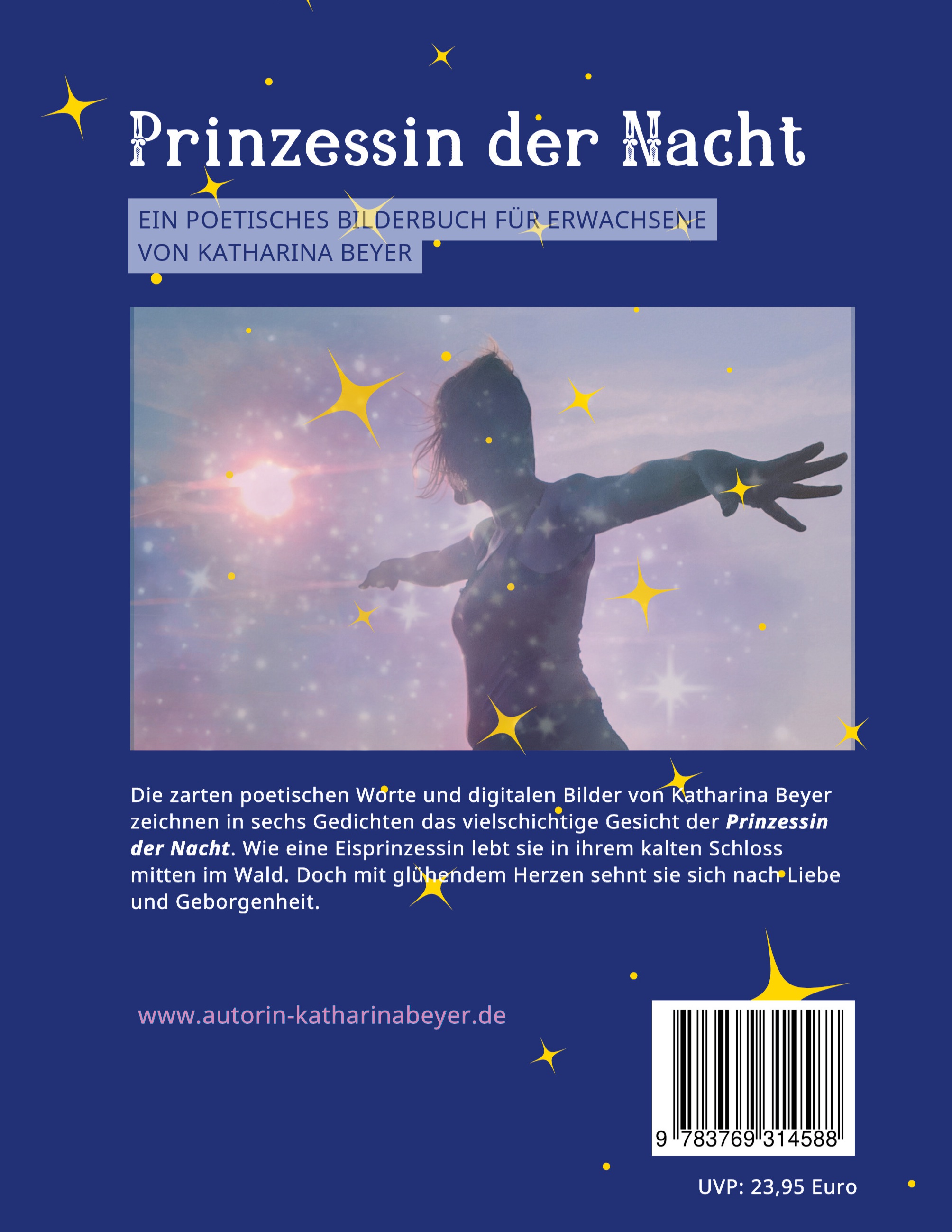 Ein Bilderbuch für Erwachsene: Die zarten poetischen Worte und digitalen Bilder von Katharina Beyer zeichnen in sechs Gedichten das vielschichtige Gesicht der Prinzessin der Nacht. Wie eine Eisprinzessin lebt sie in ihrem kalten Schloss mitten im Wald. Doch mit glühendem Herzen sehnt sie sich nach Liebe und Geborgenheit.