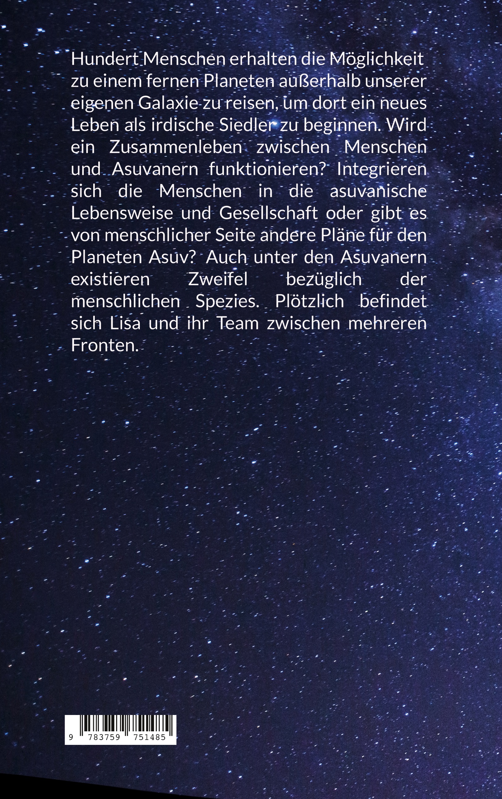 Hundert Menschen erhalten die Möglichkeit zu einem fernen Planeten zu reisen und dort ein neues Leben als irdische Siedler zu beginnen. Wird das Zusammenleben zwischen Menschen und Asuvanern funktionieren? Integrieren sich die Menschen in die asuvanische Lebensweise oder gibt es von menschlicher Seite andere Pläne für den Planeten Asuv? Aber auch nicht alle Asuvaner sind von dem Siedlerprojekt überzeugt. Plötzlich befindet sich Lisa und ihr Team zwischen mehreren Fronten.