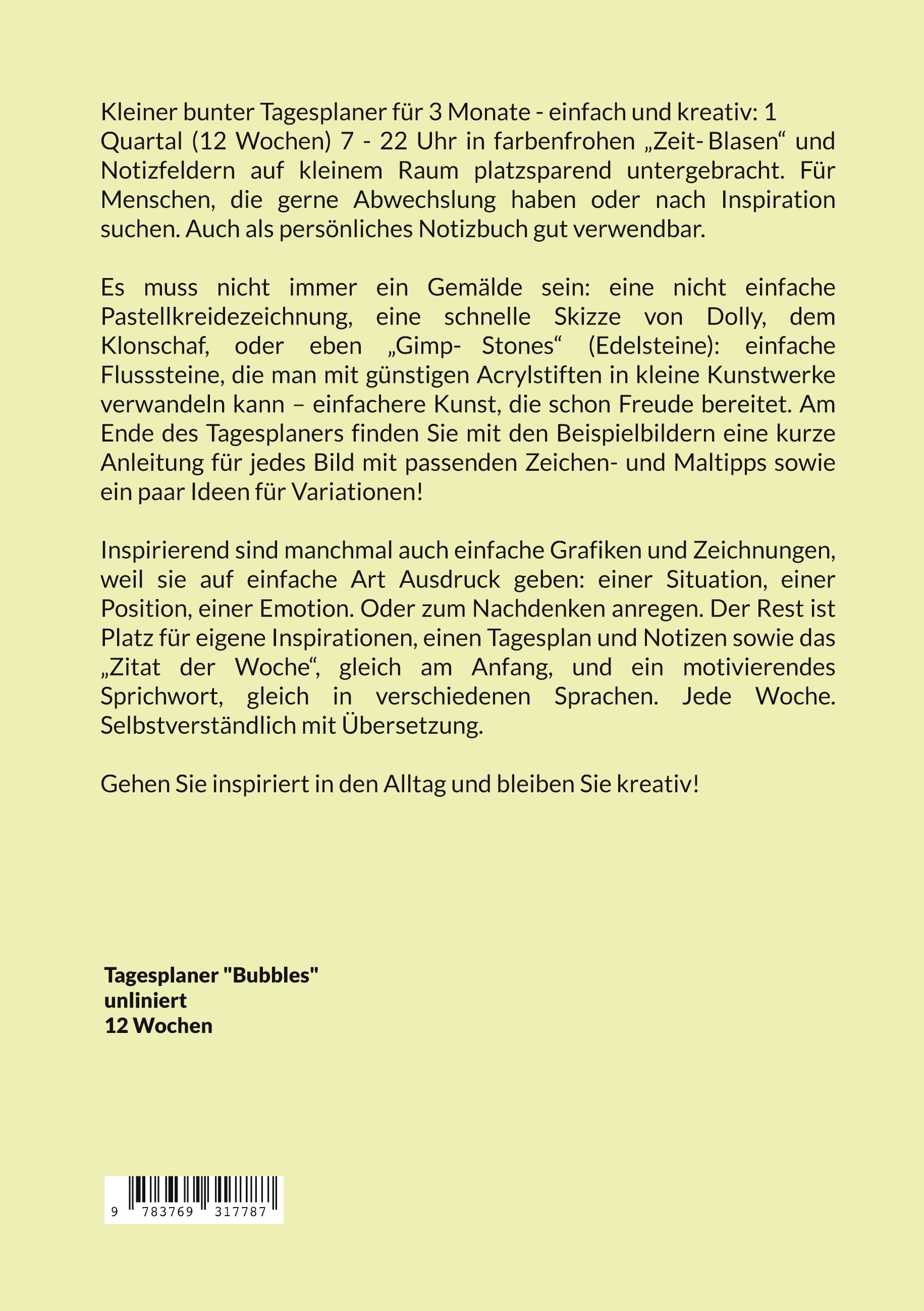 Kleiner bunter Tagesplaner für 3 Monate, einfach und kreativ: 12 Wochen, 07:00 - 22:00 Uhr in farbenfrohen "Zeit-Blasen". Auch als Terminplaner oder persönliches Notizbuch geeignet.