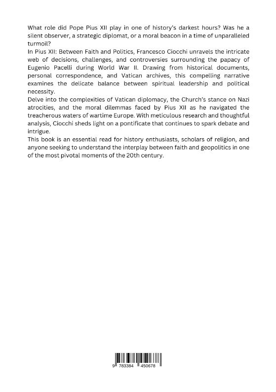What role does faith play in times of political turmoil and war?Eugenio Pacelli, better known as Pope Pius XII, led the Catholic Church during one of the most turbulent periods in history-World War II. In Pius XII: Between Faith and Politics, Francesco Ciocchi offers a comprehensive exploration of the enigmatic pontiff whose decisions and diplomacy have sparked debates for decades.Drawing from historical archives, personal correspondence, and eyewitness accounts, this book delves into Pius XII's life before and during his papacy, examining his efforts to navigate the delicate balance between moral leadership and political pragmatism. From negotiating with totalitarian regimes to his stance on the Holocaust and his vision for post-war Europe, this gripping account illuminates the complexities of a leader striving to uphold the Church's principles in an era dominated by conflict and ideology.Was Pius XII a silent protector or a cautious diplomat? Ciocchi invites readers to uncover the truth behind one of history's most polarizing figures and the enduring legacy of his decisions.For historians, theologians, and anyone intrigued by the intersections of faith, politics, and human endurance, this book provides a nuanced perspective on a leader shaped by the storms of his time.