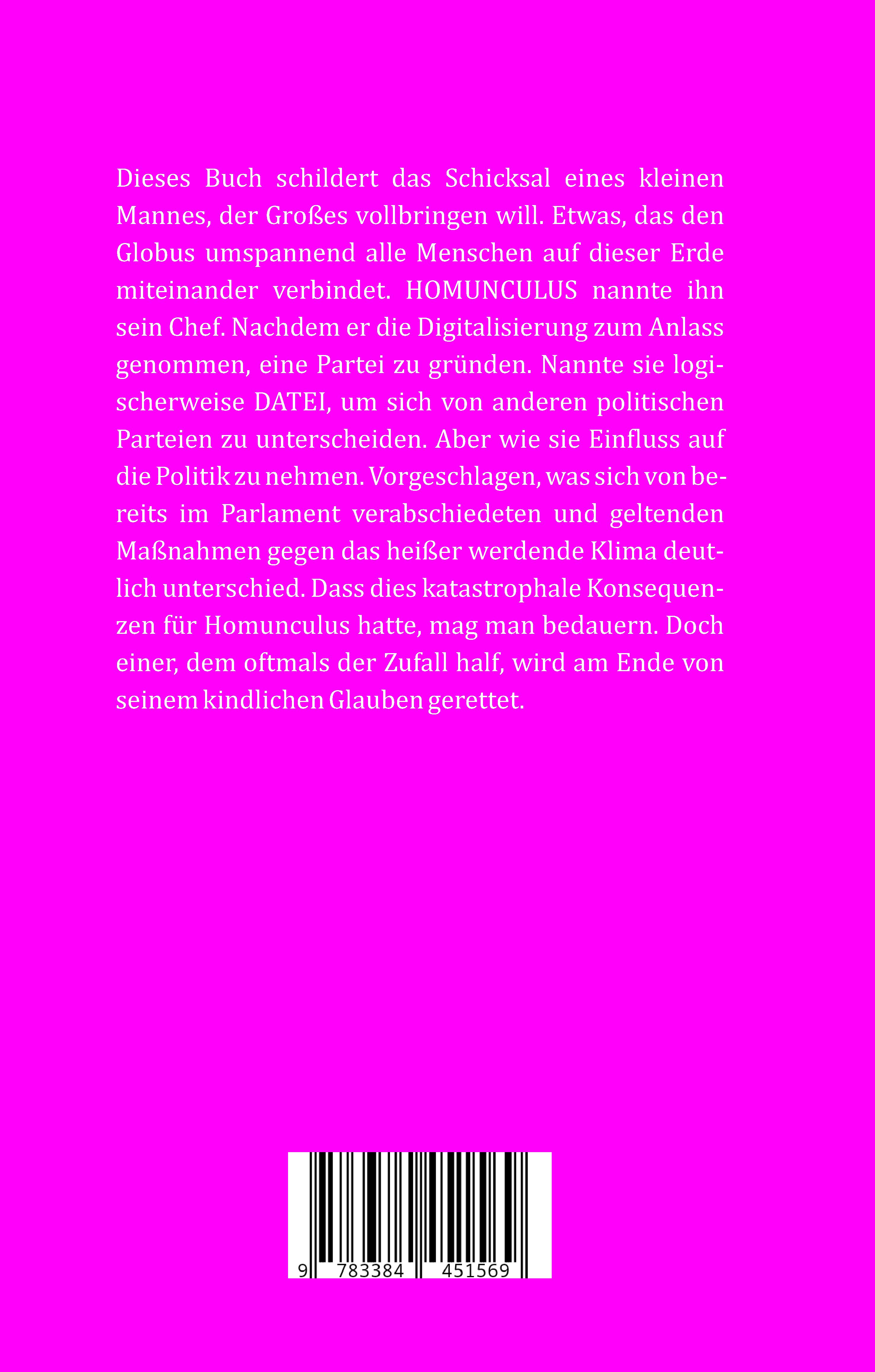 Dieses Buch schildert das Schicksal eines kleinen Mannes, der Großes vollbringen will. Etwas, das den Globus umspannend alle Menschen auf dieser Erde miteinander verbindet. HOMUNCULUS nannte ihn sein Chef. Nachdem er die Digitalisierung zum Anlass genommen, eine Partei zu gründen. Nannte sie logischerweise DATEI, um sich von anderen politischen Parteien zu unterscheiden. Aber wie sie Einfluss auf die Politik zu nehmen. Vorgeschlagen, was sich von bereits im Parlament verabschiedeten und geltenden Maßnahmen gegen das heißer werdende Klima deutlich unterschied. Dass dies katastrophale Konsequenzen für Homunculus hatte, mag man bedauern. Doch einer, dem oftmals der Zufall half, wird am Ende von seinem kindlichen Glauben gerettet.