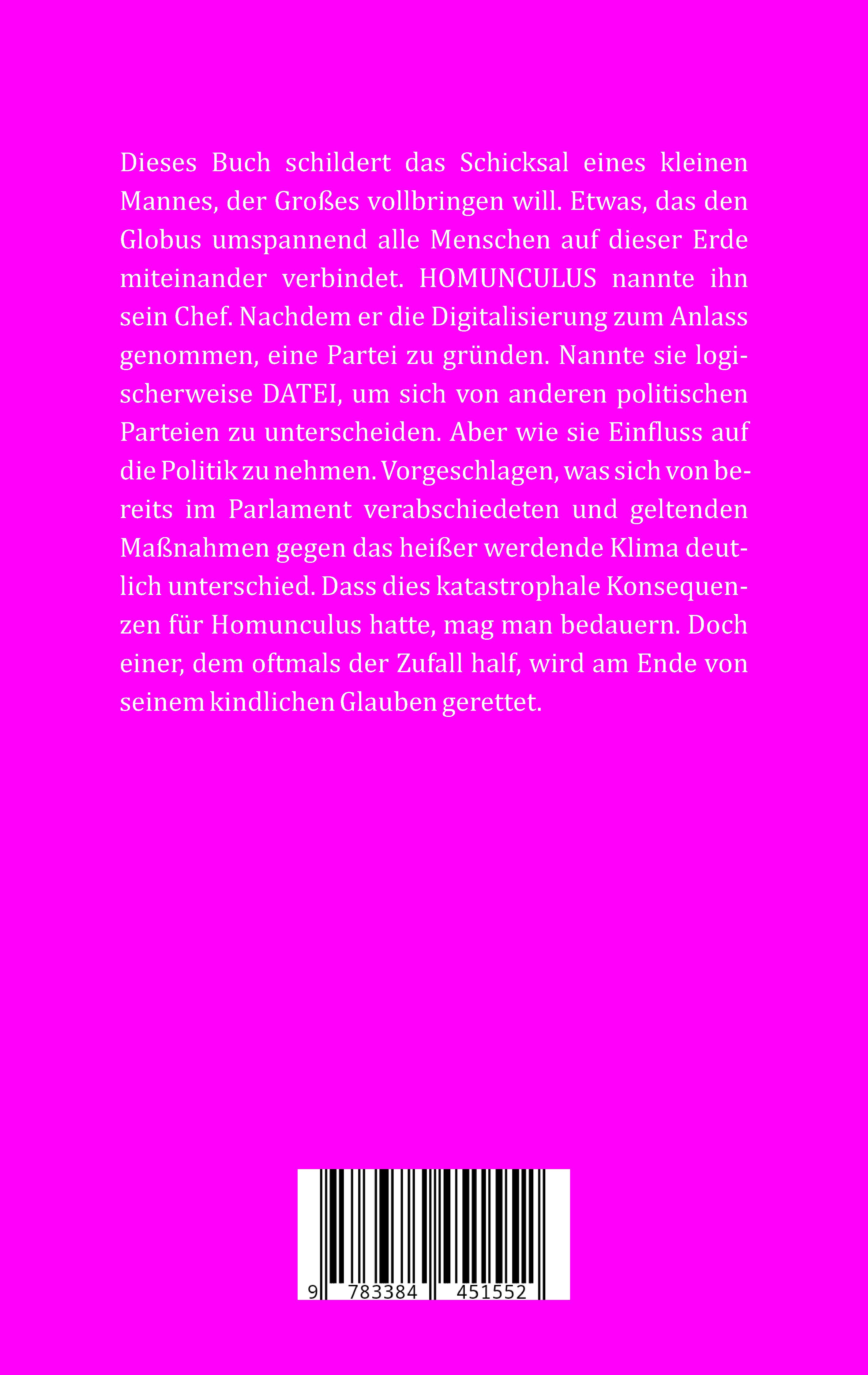 Dieses Buch schildert das Schicksal eines kleinen Mannes, der Großes vollbringen will. Etwas, das den Globus umspannend alle Menschen auf dieser Erde miteinander verbindet. HOMUNCULUS nannte ihn sein Chef. Nachdem er die Digitalisierung zum Anlass genommen, eine Partei zu gründen. Nannte sie logischerweise DATEI, um sich von anderen politischen Parteien zu unterscheiden. Aber wie sie Einfluss auf die Politik zu nehmen. Vorgeschlagen, was sich von bereits im Parlament verabschiedeten und geltenden Maßnahmen gegen das heißer werdende Klima deutlich unterschied. Dass dies katastrophale Konsequenzen für Homunculus hatte, mag man bedauern. Doch einer, dem oftmals der Zufall half, wird am Ende von seinem kindlichen Glauben gerettet.