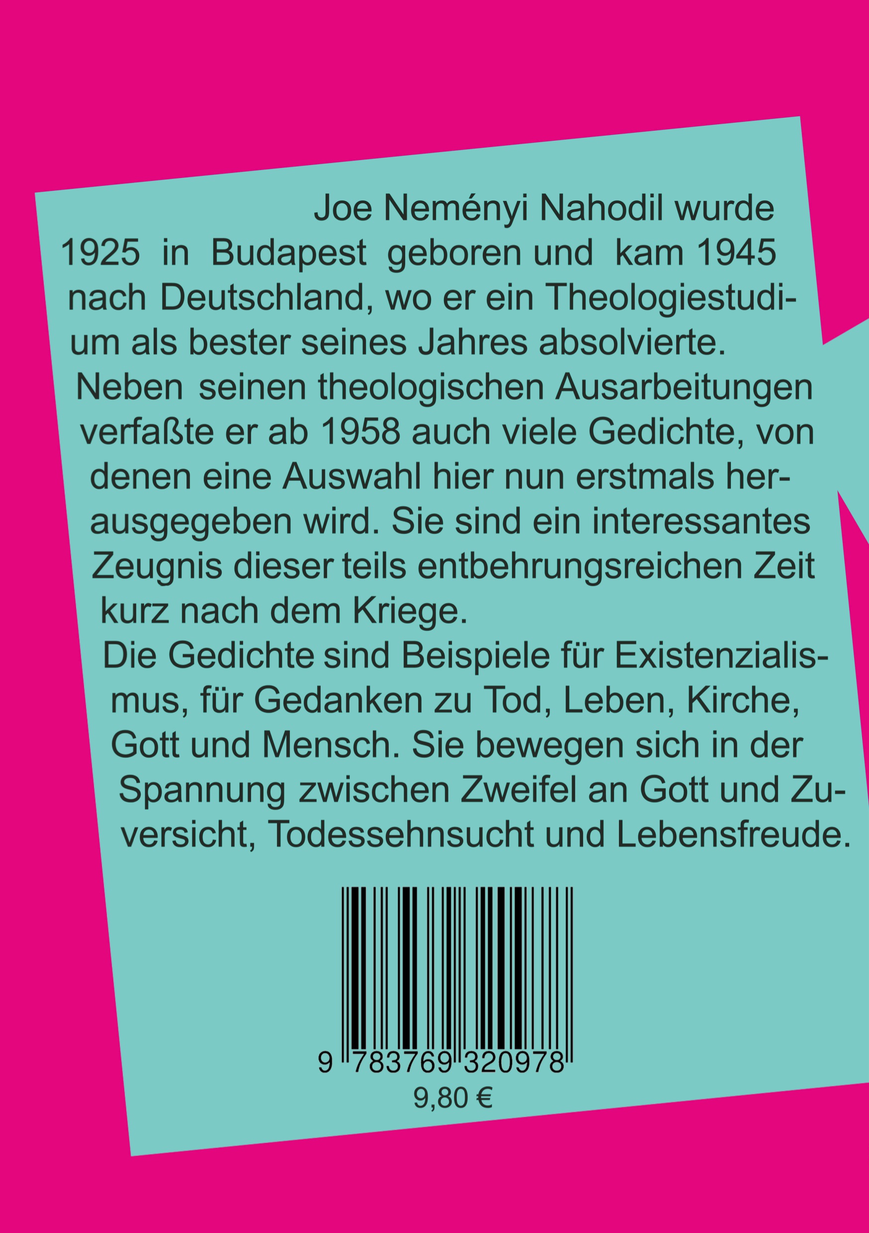 Joe Neményi Nahodil 1925 in Budapest geboren, war ein Philosoph, Theologe, Existenzialist und auch Dichter. Im Verlauf des Krieges 1945 nach Deutschland verschleppt, begann seine Tätigkeit als Dichter um 1958. Zahlreiche theologische Abhandlungen hat er verfaßt, die noch auf eine Veröffentlichung warten. Von seinen Gedichten liegt hier erstmals eine Sammlung vor. Joe Neményi Nahodil heiratete 1955 und hatte 4 Kinder. Er arbeitete als wissenschaftlicher Bibliothekar beim Bundesminister für Forschung und Technologie und er starb in Bonn im Jahre 2016.
