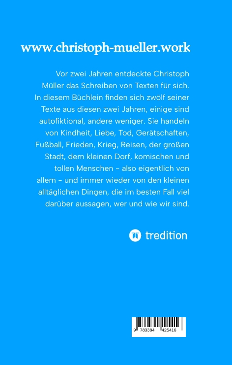 In den 1950er und 1960er Jahren wuchs Christoph Müller in einem nordhessischen Dorf auf, lebt seit über 40 Jahren in Berlin. Er ist Soziologe und Pädagoge, verdiente sein Geld in den 30 Jahren vor seinem Ruhestand als Manager in der IT-Industrie. Vor zwei Jahren entdeckte er das Schreiben von Texten für sich … Neben dem Schreiben fotografiert Christoph Müller gerne. Weitere Informationen, Texte, Fotos zu den Texten und einfach nur Fotos der letzten Jahre finden sich auf seiner Website … www.christoph-mueller.work ...
