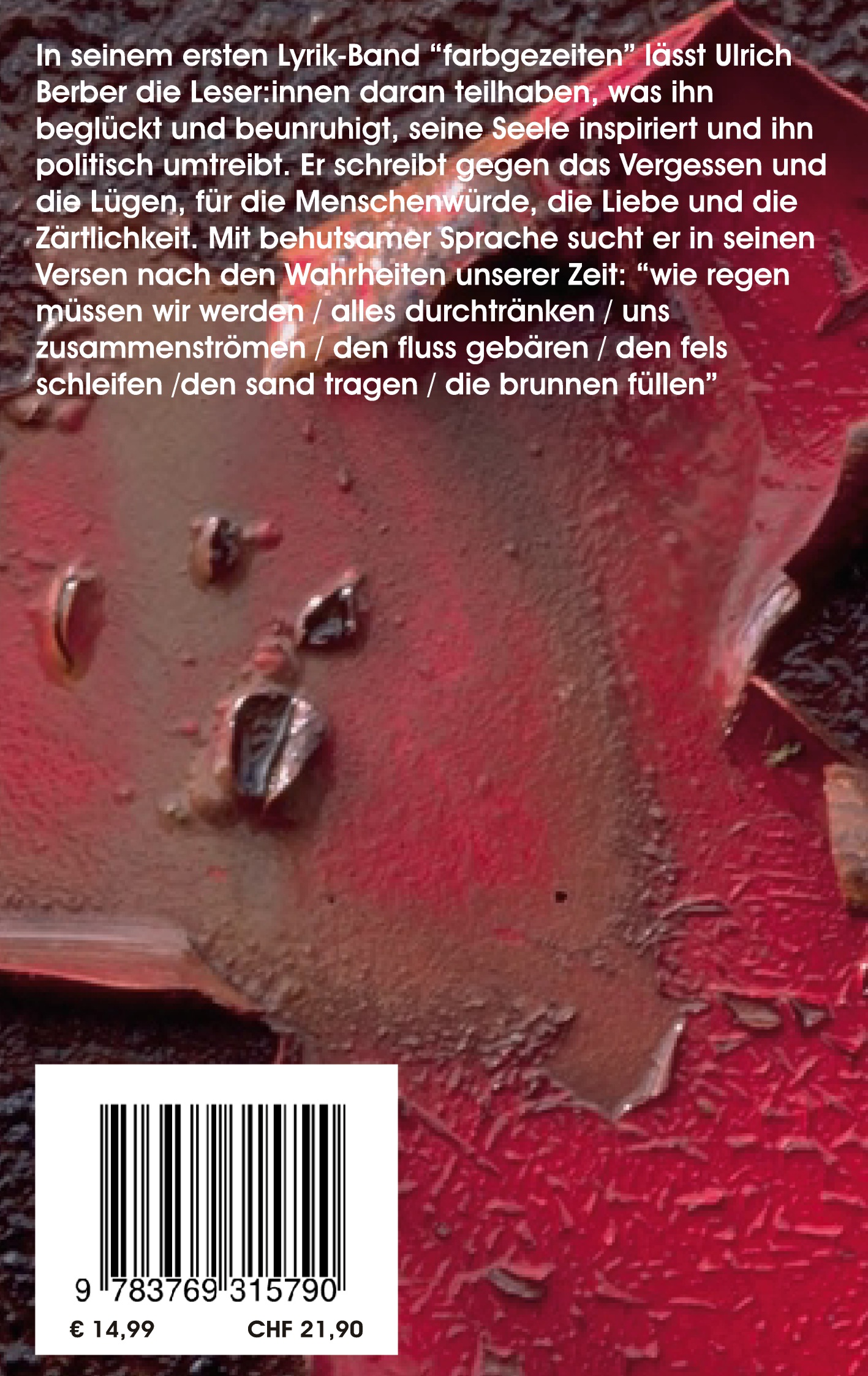 In seinem ersten Lyrik-Band "farbgezeiten" lässt Ulrich Berber die Lerser:innen daran teilhaben, was in beglückt und beunruhigt, seine Seele inspiriert und ihn politisch umtreibt. Er schreibt gegen das Vergessen, für Menschenwürde und die Zärtlichkeit. Mit behutsamer Sprache sucht er in seinen Versen nach den Wahrheiten unserer Zeit: "wie regen müssen wir werden, alles durchtränken, uns zusammenströmen, den fluss gebären, den fels schleifen, den sand tragen, die brunnen füllen, die feuer löschen"
