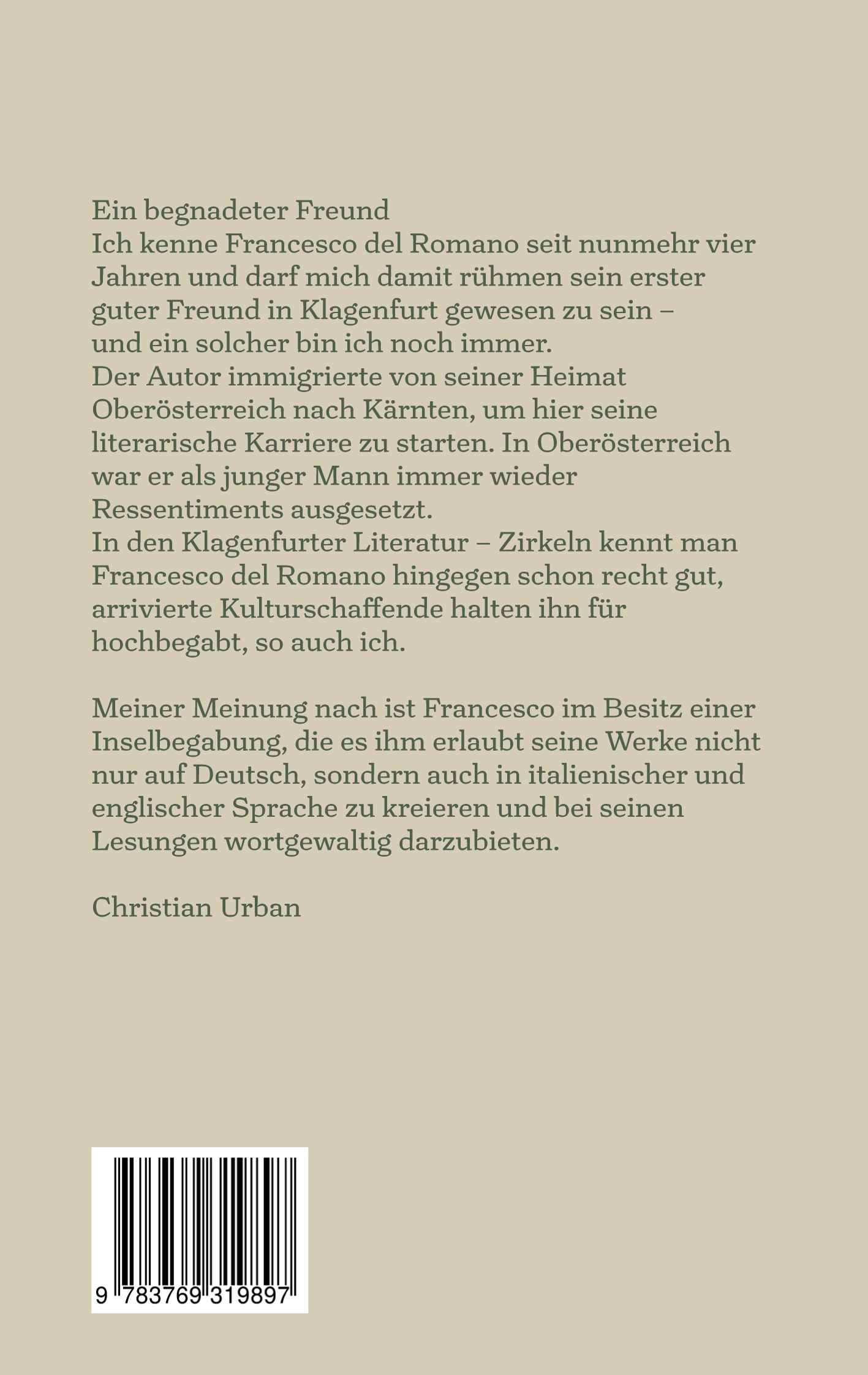 Francesco del Romano, geboren 1984 in Steyr, Österreich, war und ist ein Liebhaber der italienischen Literatur. Diese hat er sich, teils an verschiedenen Universitäten, jedoch größtenteils als Autodidakt in jahrelangem Studium angeeignet. Dante, Boccaccio, Petrarca, Leopardi, Pavese. Nur einige große illustre Namen der italienischen Literaturgeschichte bereiteten seinem Schreiben maßgebliche Inspiration. Er schreibt in drei Sprachen: Deutsch, Italienisch und Englisch. Genau genommen durchwegs eine Seltenheit für einen Schriftsteller. Seit nunmehr über vier Jahren hat der Lyriker seinen Lebensmittelpunkt von Linz nach Klagenfurt verlegt. Aus vergangener Lethargie und Depression sozusagen wieder auferstanden, schreibt und wirkt er fleißig bei BUCH13 (der größten Kärntner Literaturbühne), wo er unter anderem auch schon den einen oder anderen Auftritt mit Erfolg bestritten. Bei Books on Demand sind bisher von Francesco del Romano erschienen: Der Blumenwolf 2015 Der glücklose Schlafwandler 2016 Gedeihen und Verblühen 2018 Vor allen Dingen als Lyriker bekannt, versucht er sich mit Die Helden der letzten Tage an der Erzählkunst.