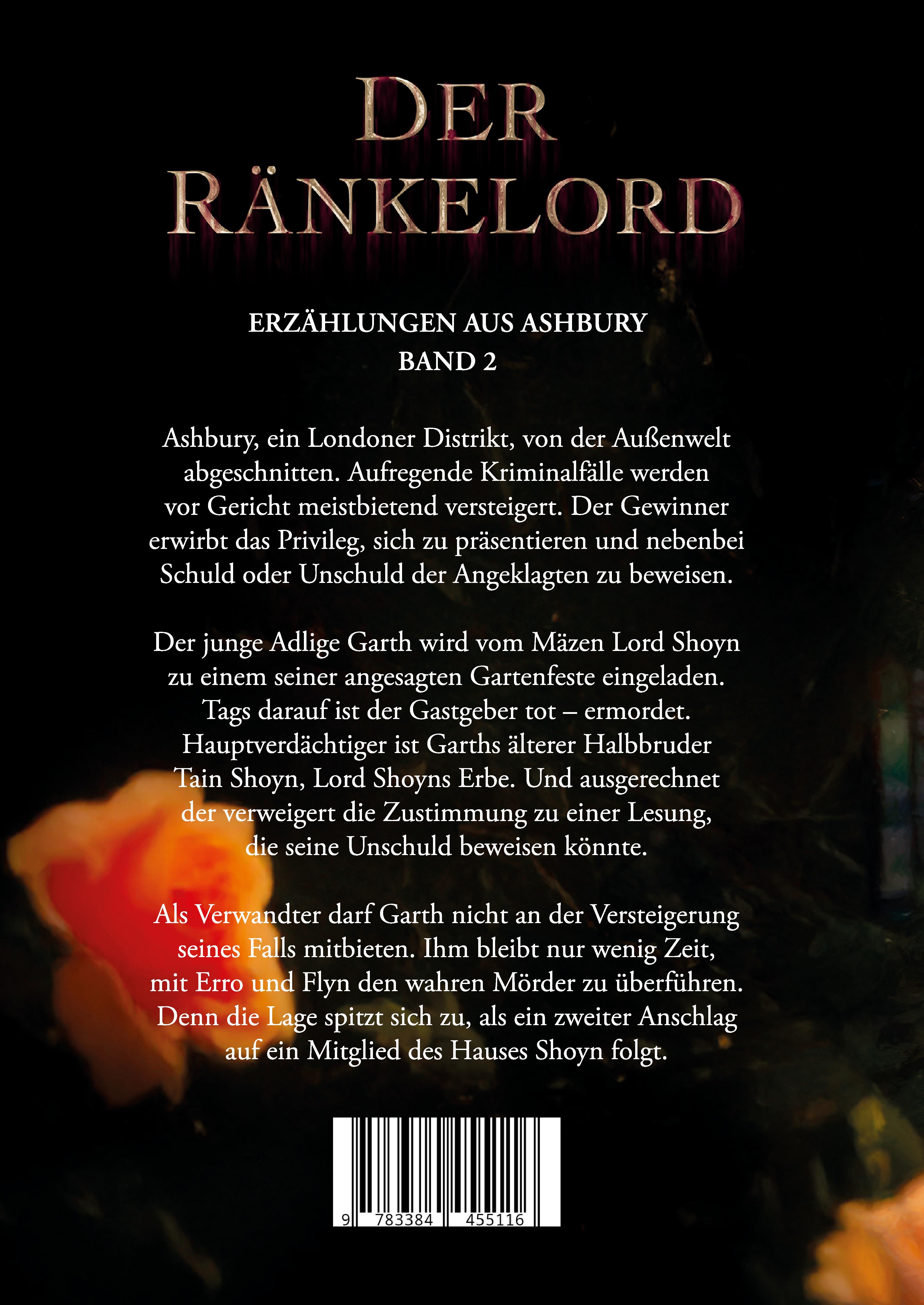Ashbury, ein Londoner Distrikt, von der Außenwelt abgeschnitten. Aufregende Kriminalfälle werden vor Gericht meistbietend versteigert. Der Gewinner erwirbt das Privileg, sich zu präsentieren und nebenbei Schuld oder Unschuld der Angeklagten zu beweisen. Der junge Adlige Garth wird vom Mäzen Lord Shoyn zu einem seiner angesagten Gartenfeste eingeladen. Tags darauf ist der Gastgeber tot - ermordet. Hauptverdächtiger ist Garths älterer Halbbruder Tain Shoyn, Lord Shoyns Erbe. Und ausgerechnet der verweigert die Zustimmung zu einer Lesung, die seine Unschuld beweisen könnte. Als Verwandter darf Garth nicht an der Versteigerung seines Falls mitbieten. Ihm bleibt nur wenig Zeit, mit Erro und Flyn den wahren Mörder zu überführen. Denn die Lage spitzt sich zu, als ein zweiter Anschlag auf ein Mitglied des Hauses Shoyn folgt.