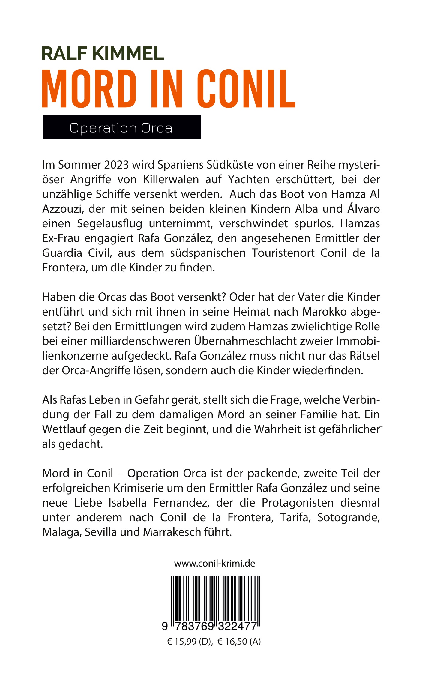 Mord in Conil - Operation Orca ist der packende, zweite Teil der erfolgreichen Krimiserie um den Ermittler Rafa Gonzalez und seine neue Liebe Isabella Fernandez, der die Protagonisten diesmal unter anderem nach Conil de la Frontera, Tarifa, Sotogrande, Malaga, Sevilla und Marrakesch führt.