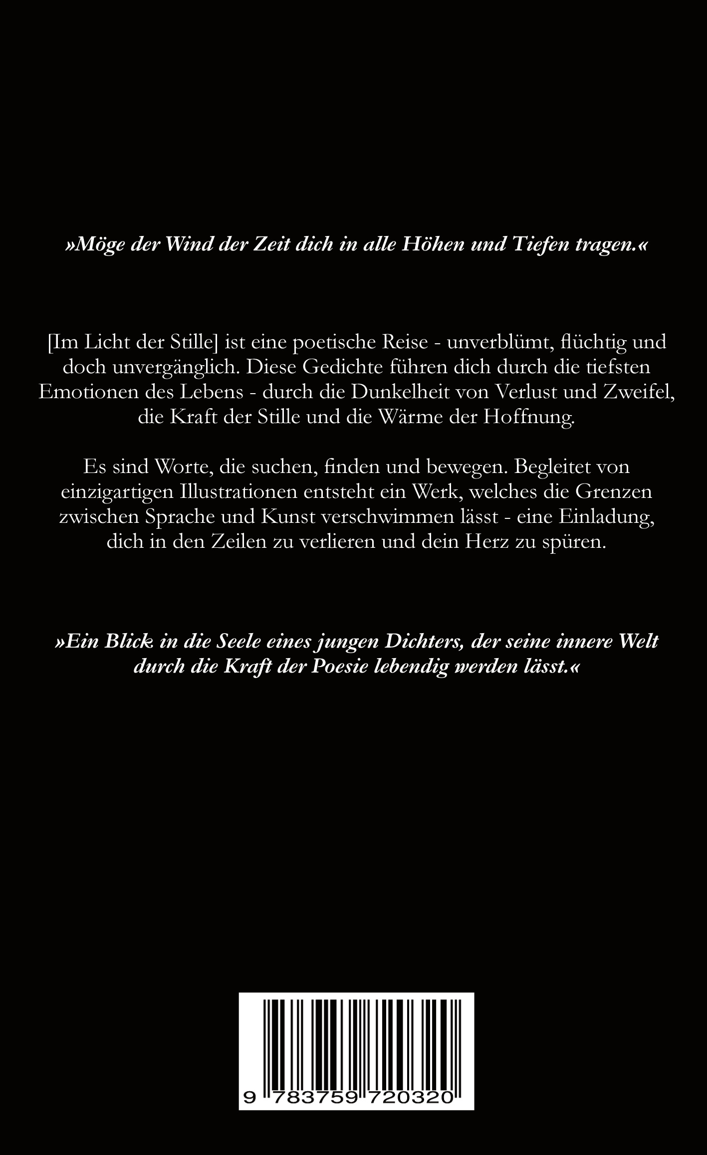 [Im Licht der Stille] ist eine poetische Reise - ehrlich, flüchtig und doch unvergänglich. Diese Gedichte führen dich durch die tiefsten Emotionen des Lebens - durch die Dunkelheit von Verlust und Zweifel, die Kraft der Stille und die Wärme der Hoffnung.
