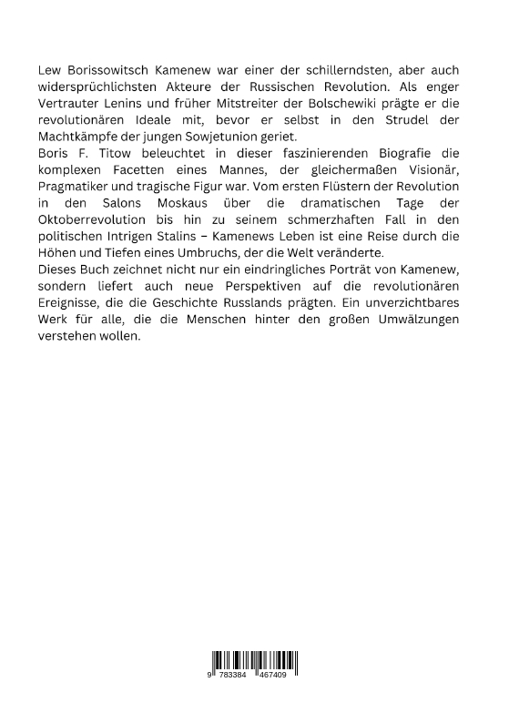 Lew Borissowitsch Kamenew war einer der schillerndsten, aber auch widersprüchlichsten Akteure der Russischen Revolution. Als enger Vertrauter Lenins und früher Mitstreiter der Bolschewiki prägte er die revolutionären Ideale mit, bevor er selbst in den Strudel der Machtkämpfe der jungen Sowjetunion geriet.Boris F. Titow beleuchtet in dieser faszinierenden Biografie die komplexen Facetten eines Mannes, der gleichermaßen Visionär, Pragmatiker und tragische Figur war. Vom ersten Flüstern der Revolution in den Salons Moskaus über die dramatischen Tage der Oktoberrevolution bis hin zu seinem schmerzhaften Fall in den politischen Intrigen Stalins - Kamenews Leben ist eine Reise durch die Höhen und Tiefen eines Umbruchs, der die Welt veränderte.Dieses Buch zeichnet nicht nur ein eindringliches Porträt von Kamenew, sondern liefert auch neue Perspektiven auf die revolutionären Ereignisse, die die Geschichte Russlands prägten. Ein unverzichtbares Werk für alle, die die Menschen hinter den großen Umwälzungen verstehen wollen.