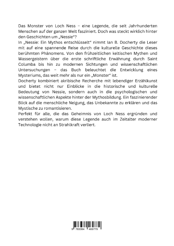 In "Nessie: Ein Mythos entschlüsselt" nimmt Ian B. Docherty die Leser mit auf eine spannende Reise durch die kulturelle Geschichte dieses berühmten Phänomens. Von den frühzeitlichen keltischen Mythen und Wassergeistern über die erste schriftliche Er-wähnung durch Saint Columba bis hin zu modernen Sichtungen und wissenschaftlichen Untersuchungen - das Buch beleuchtet die Entwicklung eines Mysteriums, das weit mehr als nur ein "Monster" ist.Docherty kombiniert akribische Recherche mit lebendiger Erzählkunst und bietet nicht nur Einblicke in die historische und kulturelle Bedeutung von Nessie, sondern auch in die psychologischen und wissenschaftlichen Aspekte hinter der Mythosbildung. Ein faszi-nierender Blick auf die menschliche Neigung, das Unbekannte zu erklären und das Mys-tische zu romantisieren.Perfekt für alle, die das Geheimnis von Loch Ness ergründen und verstehen wollen, warum diese Legende auch im Zeitalter moderner Technologie nicht an Strahlkraft verliert.