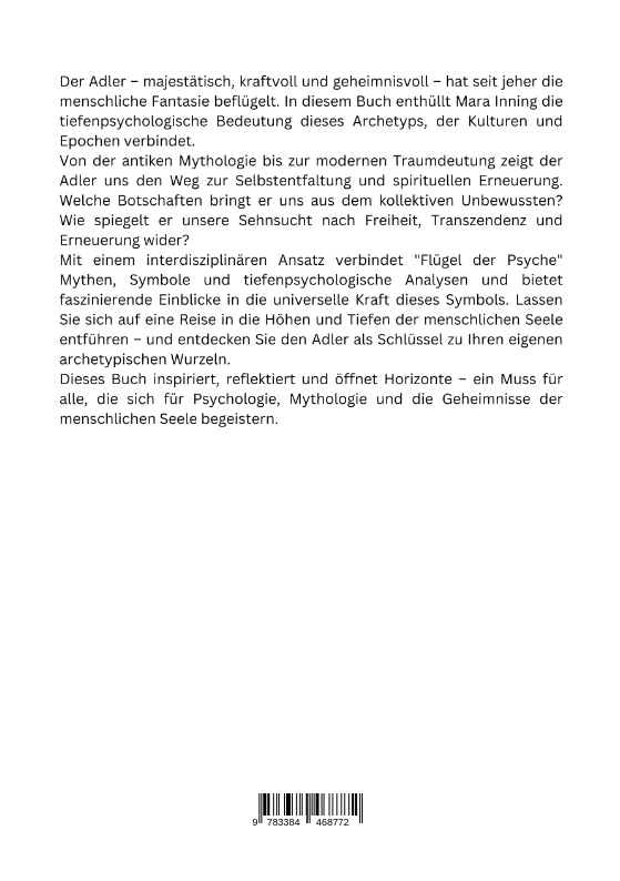 Der Adler - majestätisch, kraftvoll und geheimnisvoll - hat seit jeher die menschliche Fantasie beflügelt. In diesem Buch enthüllt Mara Inning die tiefenpsychologische Bedeutung dieses Archetyps, der Kulturen und Epochen verbindet.Von der antiken Mythologie bis zur modernen Traumdeutung zeigt der Adler uns den Weg zur Selbstentfaltung und spirituellen Erneuerung. Welche Botschaften bringt er uns aus dem kollektiven Unbewussten? Wie spiegelt er unsere Sehnsucht nach Freiheit, Transzendenz und Erneuerung wider?Mit einem interdisziplinären Ansatz verbindet "Flügel der Psyche" Mythen, Symbole und tiefenpsychologische Analysen und bietet faszinierende Einblicke in die universelle Kraft dieses Symbols. Lassen Sie sich auf eine Reise in die Höhen und Tiefen der menschlichen Seele entführen - und entdecken Sie den Adler als Schlüssel zu Ihren eigenen archetypischen Wurzeln.Dieses Buch inspiriert, reflektiert und öffnet Horizonte - ein Muss für alle, die sich für Psychologie, Mythologie und die Geheimnisse der menschlichen Seele begeistern.