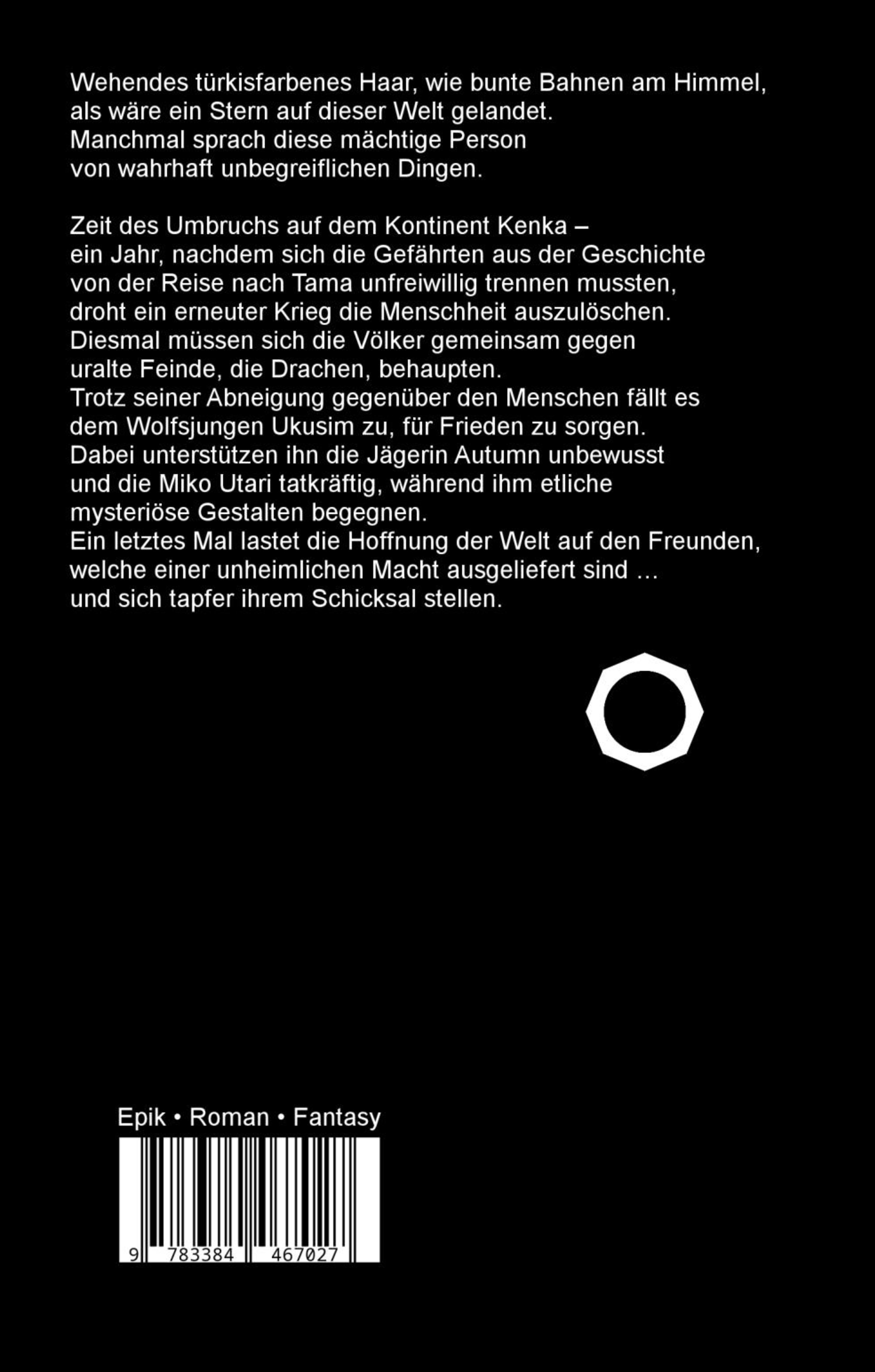 Zeit des Umbruchs auf dem Kontinent Kenka - ein Jahr, nachdem sich die Gefährten aus der Geschichte von der Reise nach Tama unfreiwillig trennen mussten, droht ein erneuter Krieg die Menschheit auszulöschen. Diesmal müssen sich die Völker gegen uralte Feinde, die Drachen, behaupten. Trotz seiner Abneigung gegenüber den Menschen fällt es dem Wolfsjungen Ukusim zu, für Frieden zu sorgen. Dabei unterstützen ihn die Jägerin Autumn unbewusst und die Miko Utari tatkräftig, während ihm etliche mysteriöse Gestalten begegnen. Ein letztes Mal lastet die Hoffnung der Welt auf den Freunden, welche einer unheimlichen Macht ausgeliefert sind ... und sich tapfer ihrem Schicksal stellen.