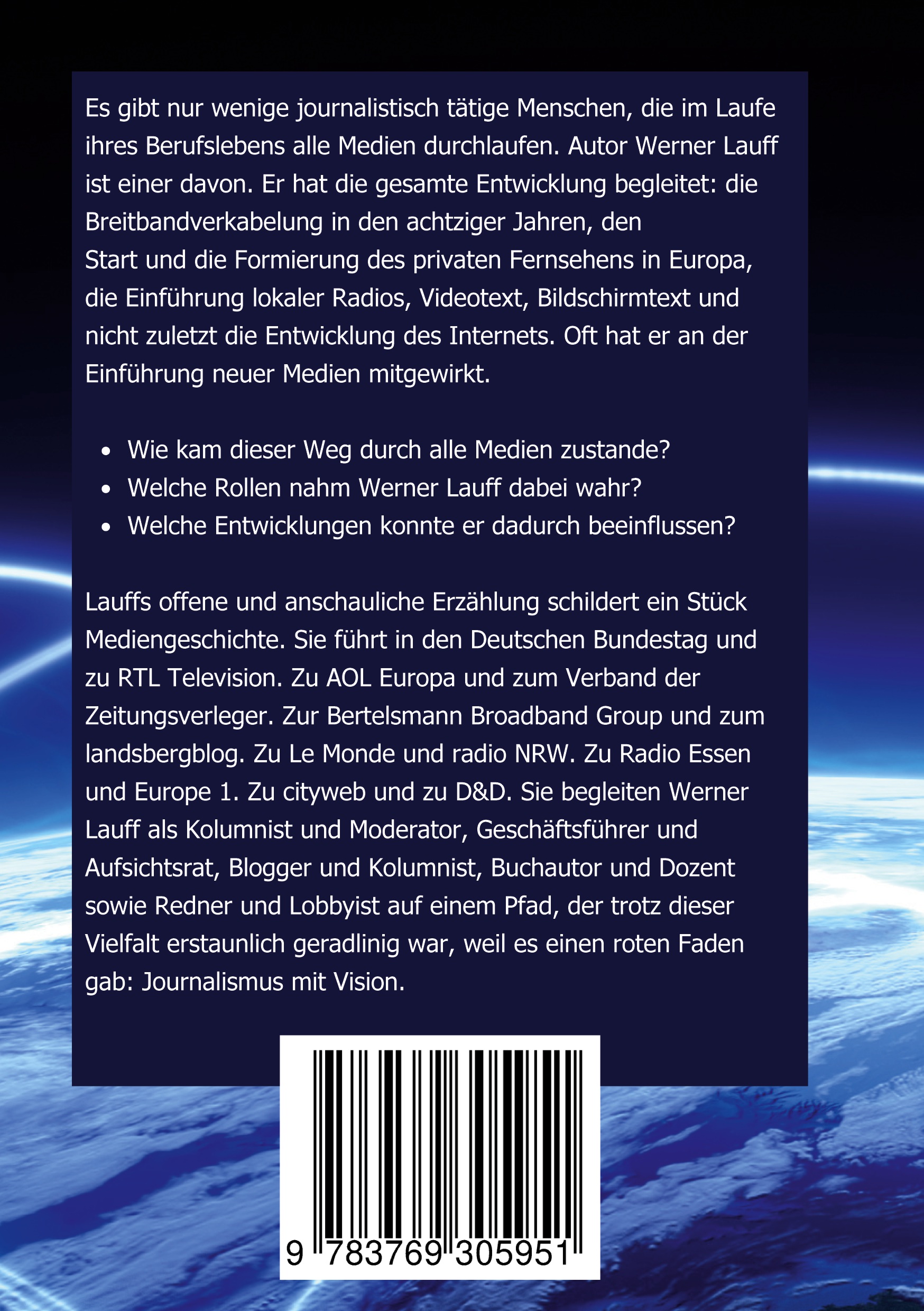 Wie kam dieser Weg durch alle Medien zustande? Welche Rollen hatte er dabei inne? Welche Entwicklungen konnte er dadurch beeinflussen? Seine Erzählung schildert ein Stück Mediengeschichte. Sie führt in den Deutschen Bundestag und zu RTL Television. Zu AOL Europa und zum Verband der Zeitungsverleger. Zur Bertelsmann Broadband Group und zum Landsbergblog. Zu Le Monde und Radio NRW. Zu Radio Essen und Europe 1. Zu Cityweb und zu D&D. Sie begleiten Werner Lauff als Kolumnist und Moderator, Geschäftsführer und Aufsichtsrat, Blogger und Kolumnist, Buchautor und Dozent sowie Redner und Lobbyist auf einem Pfad, der trotz dieser Vielfalt erstaunlich geradlinig war, weil es einen roten Faden gab: Journalismus mit Vision.