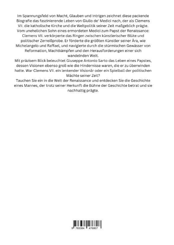 Im Spannungsfeld von Macht, Glauben und Intrigen zeichnet diese packende Biografie das faszinierende Leben von Giulio de' Medici nach, der als Clemens VII. die katholische Kirche und die Weltpolitik seiner Zeit maßgeblich prägte.Vom unehelichen Sohn eines ermordeten Medici zum Papst der Renaissance: Clemens VII. verkörperte das Ringen zwischen künstlerischer Blüte und politischer Zerreißprobe. Er förderte die größten Künstler seiner Ära, wie Michelangelo und Raffael, und navigierte durch die stürmischen Gewässer von Reformation, Machtkämpfen und den Herausforderungen einer sich wandelnden Welt.Mit präzisem Blick beleuchtet Giuseppe Antonio Sarto das Leben eines Papstes, dessen Visionen ebenso groß wie die Hindernisse waren, die er zu überwinden hatte. War Clemens VII. ein lenkender Visionär oder ein Spielball der politischen Mächte seiner Zeit?Tauchen Sie ein in die Welt der Renaissance und entdecken Sie die Geschichte eines Mannes, der trotz seiner Herkunft die Bühne der Geschichte betrat und sie nachhaltig prägte.