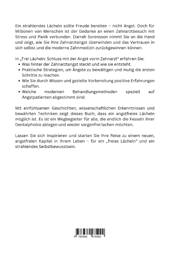Ein strahlendes Lächeln sollte Freude bereiten - nicht Angst. Doch für Millionen von Menschen ist der Gedanke an einen Zahnarztbesuch mit Stress und Panik verbunden. Darrah Sorensson nimmt Sie an die Hand und zeigt, wie Sie Ihre Zahnarztangst überwinden und das Vertrauen in sich selbst und die moderne Zahnmedizin zurückgewinnen können.In "Frei Lächeln: Schluss mit der Angst vorm Zahnarzt" erfahren Sie:Was hinter der Zahnarztangst steckt und wie sie entsteht.Praktische Strategien, um Ängste zu bewältigen und mutig die ersten Schritte zu machen.Wie Sie durch Wissen und gezielte Vorbereitung positive Erfahrungen schaffen.Welche modernen Behandlungsmethoden speziell auf Angstpatienten abgestimmt sind.Mit einfühlsamen Geschichten, wissenschaftlichen Erkenntnissen und bewährten Techniken zeigt dieses Buch, dass ein angstfreies Lächeln möglich ist. Es ist ein Wegbegleiter für alle, die endlich die Fesseln ihrer Dentalphobie ablegen und wieder sorgenfrei lachen möchten.Lassen Sie sich inspirieren und starten Sie Ihre Reise zu einem neuen, angstfreien Kapitel in Ihrem Leben - für ein "freies Lächeln" und ein strahlendes Selbstbewusstsein.