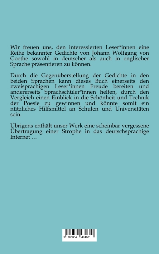 We are happy to present to the interested reader a number of well-known poems and one passage out of »Faust« by Johann Wolfgang von Goethe in both the German and the English language. We think that publishing Goethe's poems in two languages can be interesting for bilingual readers, but it may also help language students to gain an insight into the beauty and techniques of poetry by comparing both versions. So this book could be a useful tool at schools and universities. You will find in this book a poem with a stanza which seems to have been forgotten, when you look it up on the Internet.