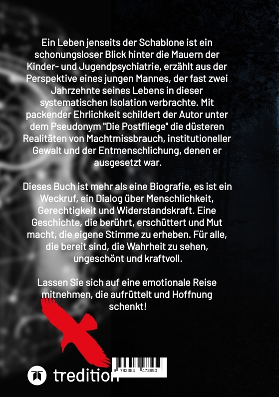 Ich schreibe unter dem Pseudonym "Die Postfliege", um meine Identität und die meiner Familie zu schützen. Meine Bücher sind nicht einfach nur Geschichten, sie sind schonungslose und kritische Einblicke in die Welt der Psychiatrie. Ich wurde mit vierzehn Jahren gegen meinen Willen in eine psychiatrische Einrichtung eingewiesen und verbrachte dort fast 18 Jahre meines Lebens unter Zwang. Diese Zeit war geprägt von Erfahrungen, die nicht in Worte zu fassen sind, Grausamkeiten, Entmenschlichung und der Verlust jeglicher Freiheit. Das, was ich in diesen Jahren über die Behandlung von Menschen in solchen Institutionen gelernt habe, hat mich zutiefst geprägt. Mein Schreiben ist mein Weg, diese Erfahrungen zu verarbeiten, die Wahrheit ans Licht zu bringen und anderen Menschen eine Stimme zu geben, die vielleicht selbst nicht gehört werden. Mit meinen Büchern möchte ich nicht nur die düsteren Realitäten aufzeigen, sondern auch einen Dialog über Menschlichkeit, Respekt und Gerechtigkeit anstoßen.