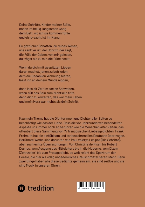 | Schlagworte | einfühlsame Übersetzung • Französische Lyrik • Liebesgedichte • Liebeslyrik • Lyrik • Poesie • tonbewahrende Übersetzung • wohlklingend • zeitlos • Zweisprachig |