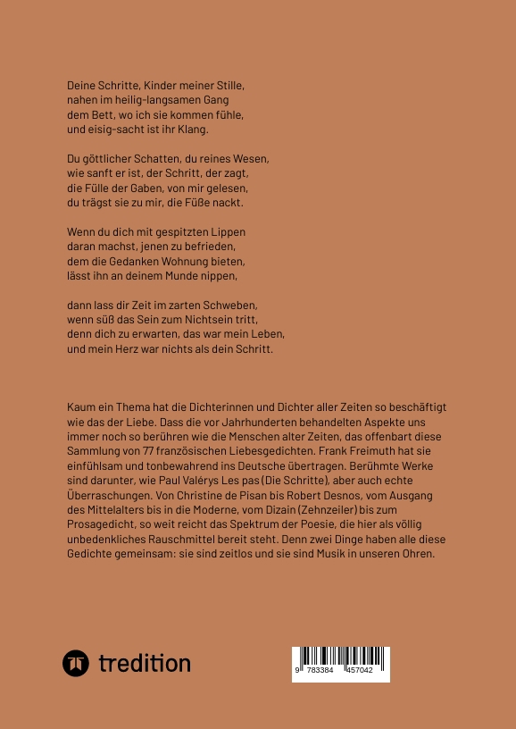 | Schlagworte | einfühlsame Übersetzung • Französische Lyrik • Liebesgedichte • Liebeslyrik • Lyrik • Poesie • tonbewahrende Übersetzung • wohlklingend • zeitlos • Zweisprachig |