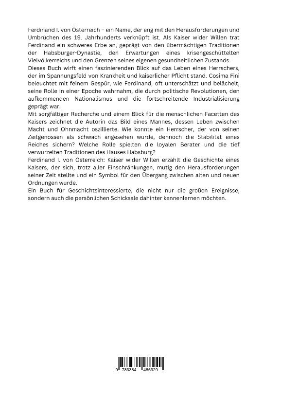 | Schlagworte | Dynastie der Habsburger • Ferdinand I. • Habsburger Monarchie • Kaiserliche Geschichte • Kaiserreich Österreich • Kaiser wider Willen • Krankheit und Herrschaft • Macht und Ohnmacht • Revolution 1848 • Vielvölkerstaat |