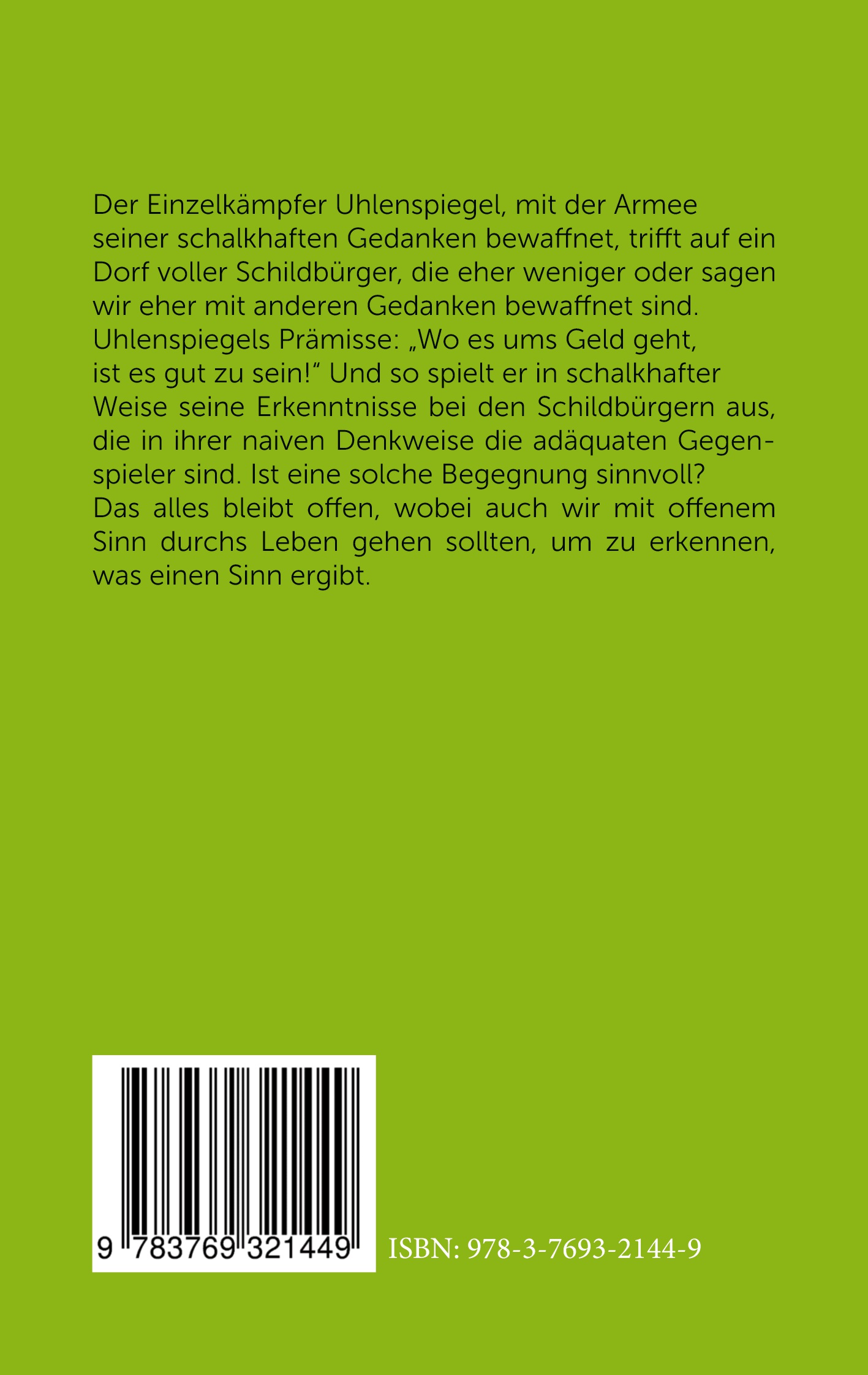 Der Einzelkämpfer Uhlenspiegel, mit der Armee seiner schalkhaften Gedanken bewaffnet, trifft auf ein Dorf voller Schildbürger, die eher weniger oder sagen wir eher mit anderen Gedanken bewaffnet sind.