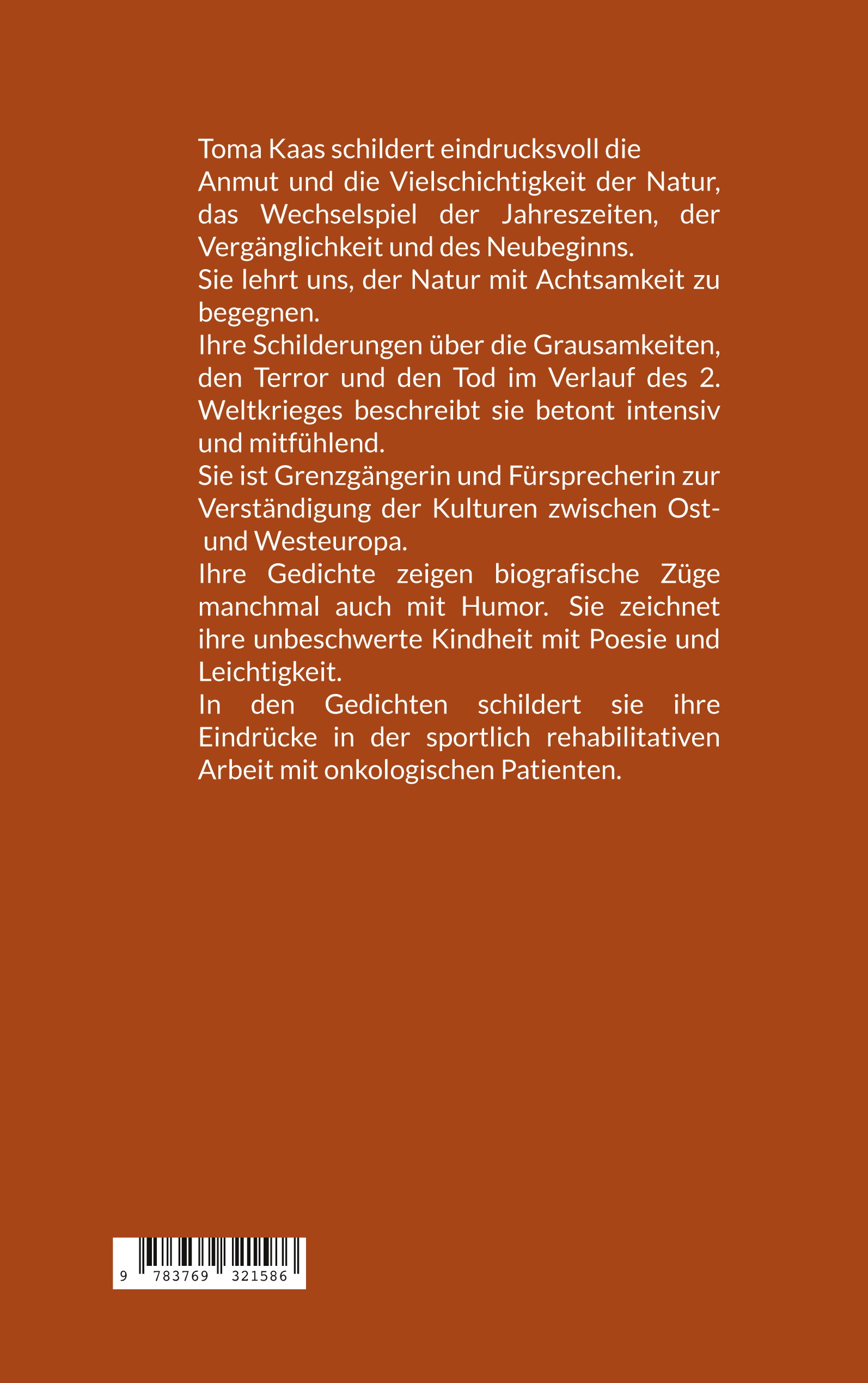 Toma Kaas war jahrelang im klinisch-medizinischem Bereich tätig und studierte Sozialwissenschaften. Sie ist im sportlich rehabilitativen Bereich tätig. Seit Jahren widmet sie sich der Poesie. Sie hat mehrfach Lesungen u.a. im Zusammenhang des UNESCO Weltpoesietages am 21.03.24 durchgeführt. Sie ist in Kosel und Warschau aufgewachsen und ist in Mannheim ansässig.