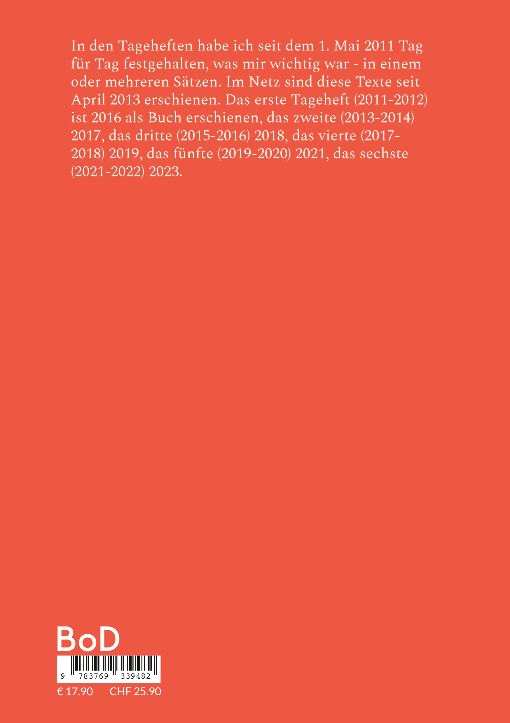 In den Tageheften habe ich seit dem 1. Mai 2011 Tag für Tag festgehalten, was mir wichtig war - in einem oder mehreren Sätzen. Im Netz sind diese Texte seit April 2013 erschienen. Das erste Tageheft (2011-2012) ist 2016 als Buch erschienen, das zweite (2013-2014) 2017, das dritte (2015-2016) 2018, das vierte (2017-2018) 2019, das fünfte (2019-2020) 2021, das sechste (2021-2022) 2023.