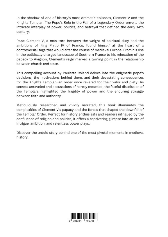 In the shadow of one of history's most dramatic episodes, Clement V and the Knights Templar: The Pope's Role in the Fall of a Legendary Order unveils the intricate interplay of power, politics, and betrayal that defined the early 14th century.Pope Clement V, a man torn between the weight of spiritual duty and the ambitions of King Philip IV of France, found himself at the heart of a controversial saga that would al-ter the course of medieval Europe. From his rise in the politically charged landscape of Southern France to his relocation of the papacy to Avignon, Clement's reign marked a turning point in the relationship between church and state.This compelling account by Paulette Roland delves into the enigmatic pope's decisions, the motivations behind them, and their devastating consequences for the Knights Templar-an order once revered for their valor and piety. As secrets unraveled and accusations of heresy mounted, the fateful dissolution of the Templars highlighted the fragility of power and the enduring struggle between faith and authority.Meticulously researched and vividly narrated, this book illuminates the complexities of Clement V's papacy and the forces that shaped the downfall of the Templar Order. Perfect for history enthusiasts and readers intrigued by the confluence of religion and politics, it offers a captivating glimpse into an era of intrigue, ambition, and relentless power plays.Discover the untold story behind one of the most pivotal moments in medieval history.