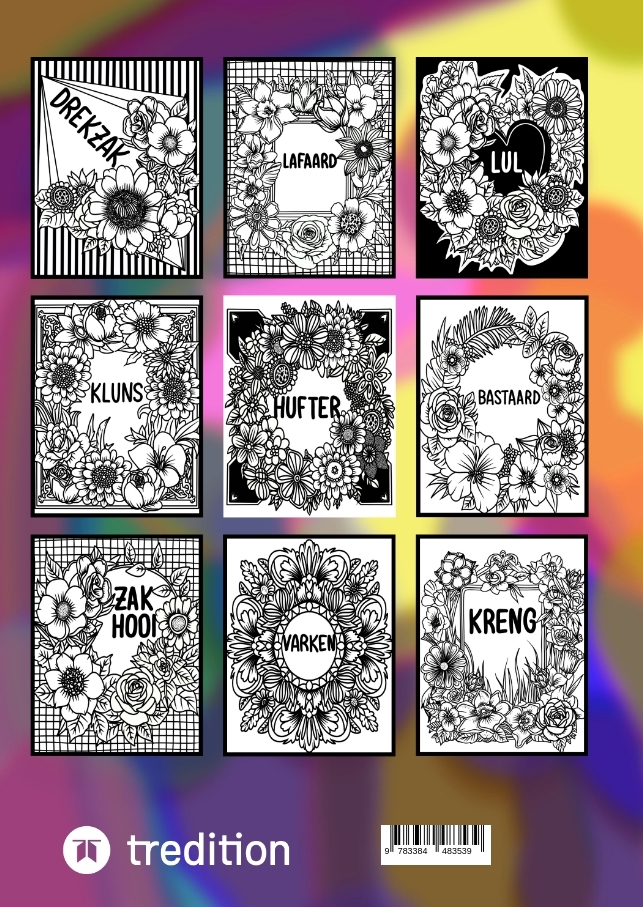 In dit kleurboek voor volwassenen vind je 15 met de hand getekende afbeeldingen van prachtige bloemenkransen om in te kleuren, met in het midden scheldwoorden. Het contrast tussen de elegante ontwerpen en de scherpe woorden maakt dit boek uniek. Dit boek is perfect geschikt voor volwassenen die graag kleuren én misschien een klein agressieprobleempje hebben. De ingekleurde pagina's kunnen worden gebruikt als opvallende wanddecoratie of als ondeugend cadeau. Laat je creativiteit de vrije loop en geef een kleurrijke draai aan boosheid!
