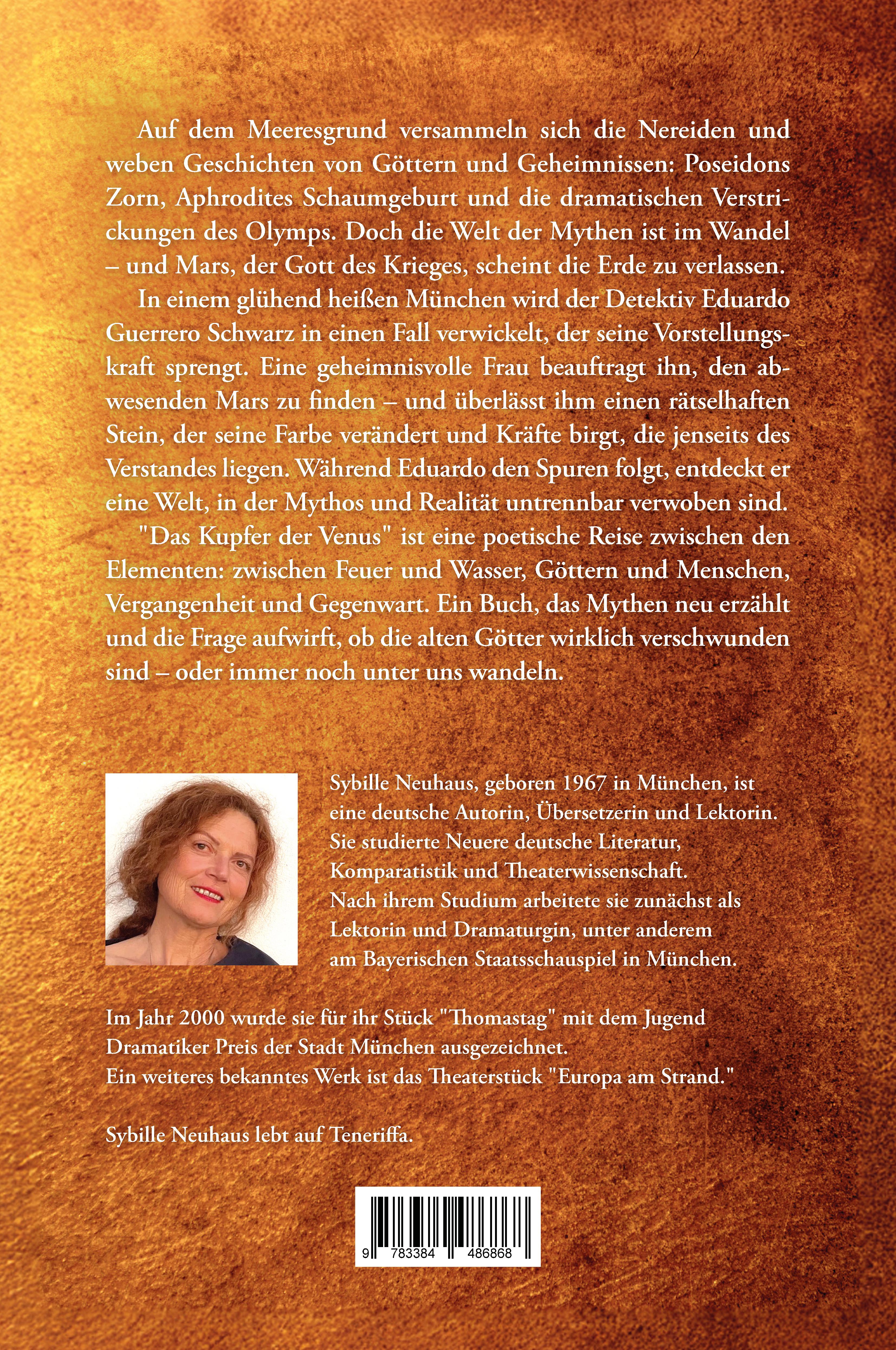 Auf dem Meeresgrund versammeln sich die Nereiden und weben Geschichten von Göttern und Geheimnissen: Poseidons Zorn, Aphrodites Schaumgeburt und die dramatischen Verstrickungen des Olymps. Doch die Welt der Mythen ist im Wandel - und Mars, der Gott des Krieges, scheint die Erde zu verlassen.In einem glühend heißen München wird der Detektiv Eduardo Guerrero Schwarz in einen Fall verwickelt, der seine Vorstellungskraft sprengt. Eine geheimnisvolle Frau beauftragt ihn, den abwesenden Mars zu finden - und überreicht ihm einen rätselhaften Stein, der seine Farbe verändert und Kräfte birgt, die jenseits des Verstandes liegen. Während Eduardo den Spuren folgt, entdeckt er eine Welt, in der Mythos und Realität untrennbar verwoben sind."Das Kupfer der Venus" ist eine poetische Reise zwischen den Elementen: zwischen Feuer und Wasser, Göttern und Menschen, Vergangenheit und Gegenwart. Ein Buch, das Mythen neu erzählt und die Frage aufwirft, ob die alten Götter wirklich verschwunden sind - oder immer noch unter uns wandeln.