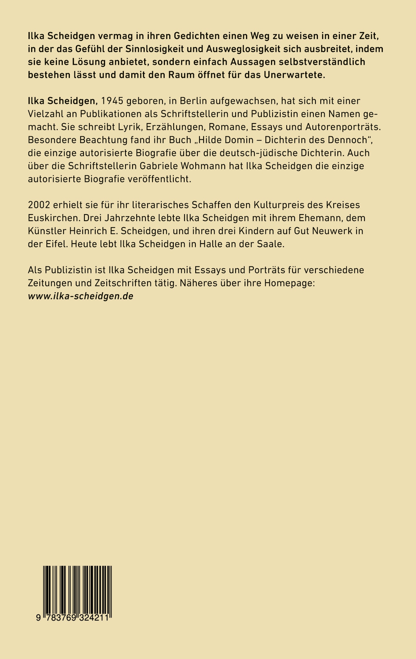 Ilka Scheidgen, 1945 geboren, in Berlin aufgewachsen, hat sich mit einer Vielzahl an Publikationen als Schriftstellerin und Publizistin einen Namen gemacht. Sie schreibt Lyrik, Erzählungen, Romane, Essays und Autorenporträts. Besondere Beachtung fand ihr Buch "Hilde Domin - Dichterin des Dennoch", die einzige autorisierte Biografie über die deutsch-jüdische Dichterin. Auch über die Schriftstellerin Gabriele Wohmann hat Ilka Scheidgen die einzige autorisierte Biografie veröffentlicht. 2002 erhielt sie für ihr literarisches Schaffen den Kulturpreis des Kreises Euskirchen. Drei Jahrzehnte lebte Ilka Scheidgen mit ihrem Ehemann, dem Künstler Heinrich E. Scheidgen, und ihren drei Kindern auf Gut Neuwerk in der Eifel. Heute lebt Ilka Scheidgen in Halle an der Saale.