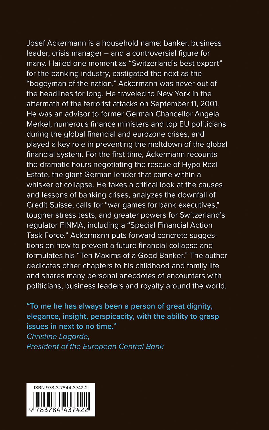 Josef Ackermann is a household name: banker, business leader, crisis manager – and a controversial figure for many. Hailed one moment as “Switzerland’s best export” for the banking industry, castigated the next as the “bogeyman of the nation,” Ackermann was never out of the headlines for long. He traveled to New York in the aftermath of the terrorist attacks on September 11, 2001. He was an advisor to former German Chancellor Angela Merkel, numerous finance ministers and top EU politicians during the global financial and eurozone crises, and played a key role in preventing the meltdown of the global financial system. For the first time, Ackermann recounts the dramatic hours negotiating the rescue of Hypo Real Estate, the giant German lender that came within a whisker of collapse. He takes a critical look at the causes and lessons of banking crises, analyzes the downfall of Credit Suisse, calls for “war games for bank executives,” tougher stress tests, and greater powers for Switzerland’s regulator FINMA, including a “Special Financial Action Task Force.” Ackermann puts forward concrete suggestions on how to prevent a future financial collapse and formulates his “Ten Maxims of a Good Banker.” The author dedicates other chapters to his childhood and family life and shares many personal anecdotes of encounters with politicians, business leaders and royalty around the world.