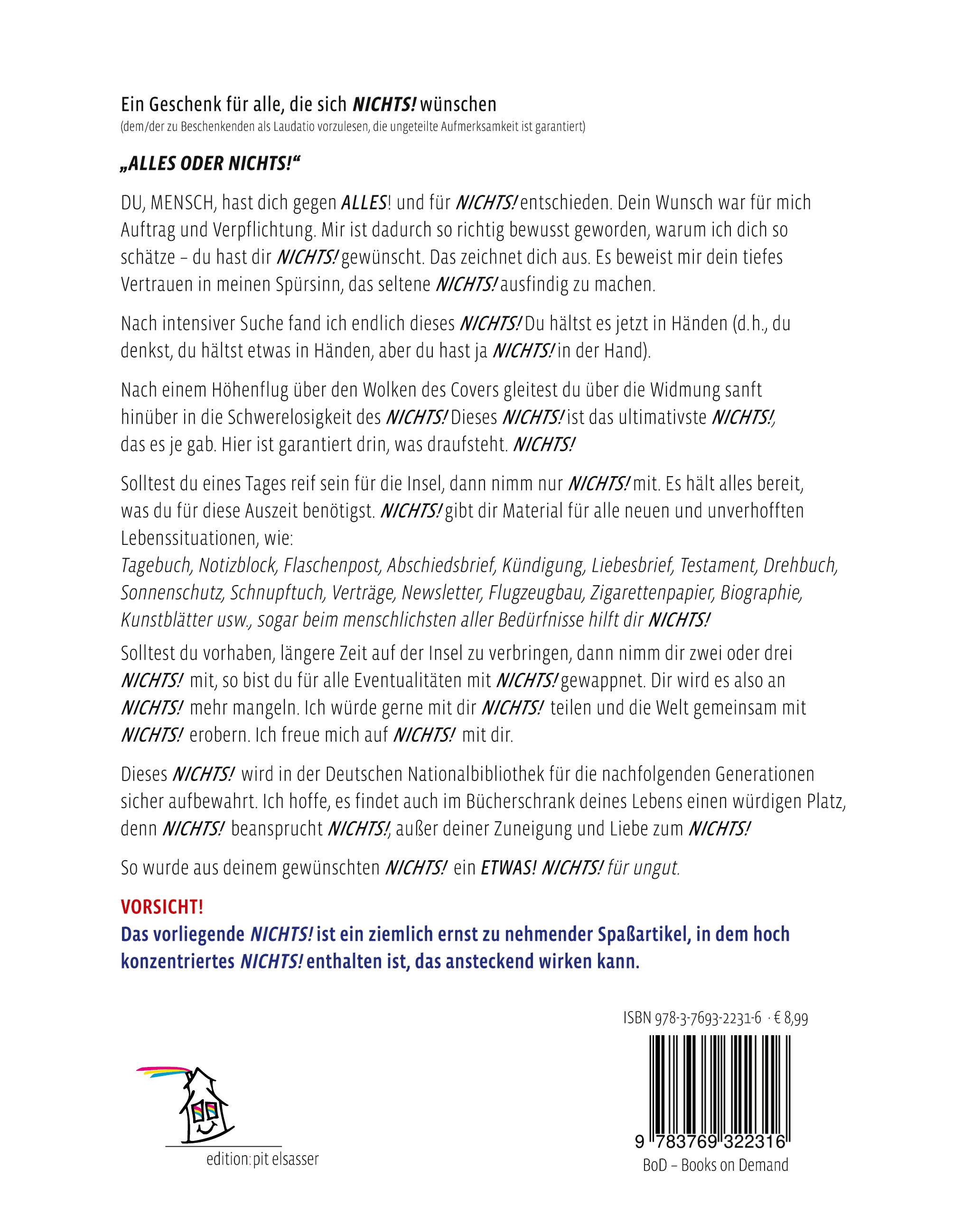 Dieses Buch ist garantiert ohne Text und nach lesen des Cover und der Widmung multiaktiv zu verwenden.