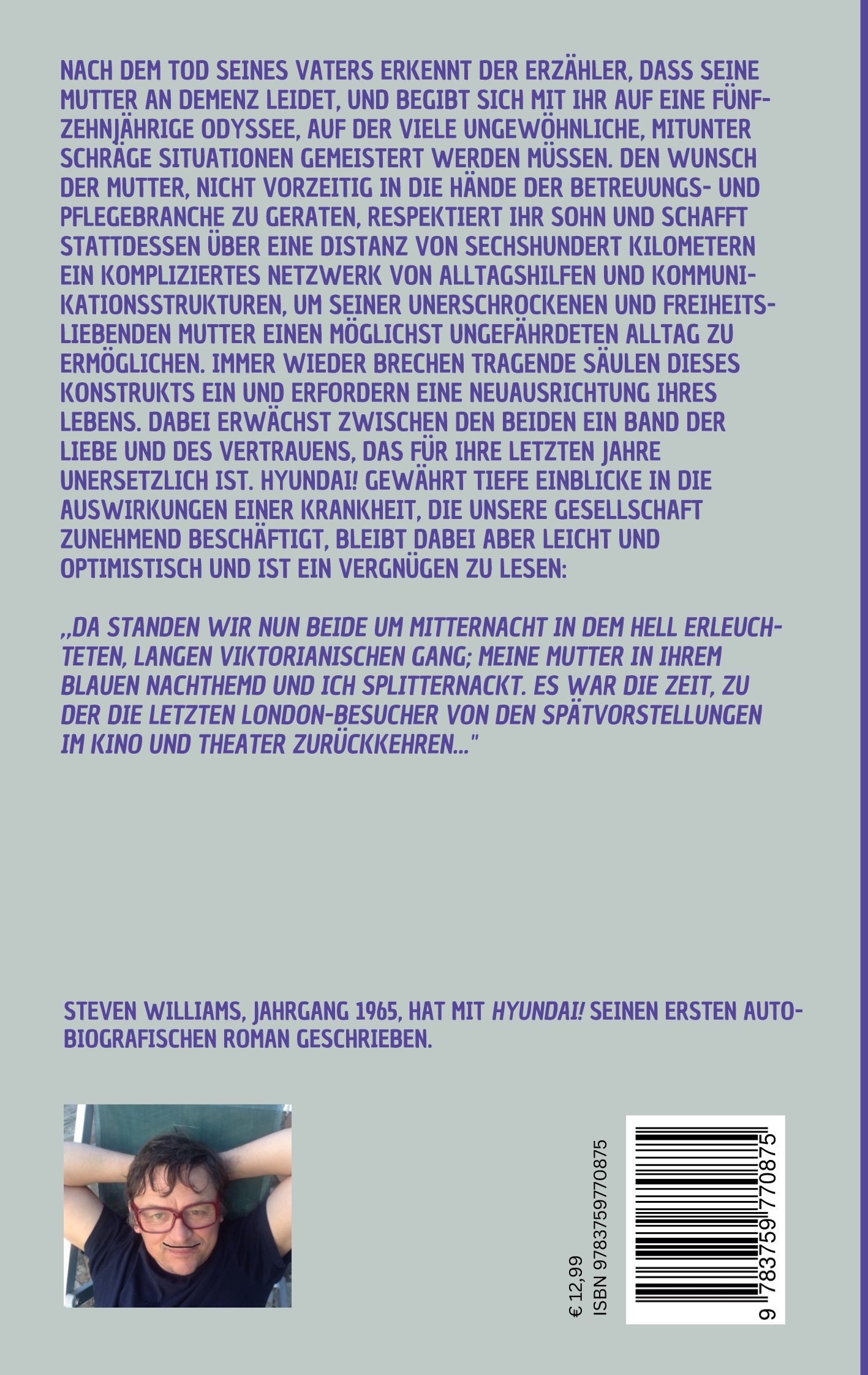 Steven Williams, geboren 1965 wuchs als Kind bei den britischen Alliierten in Nordrhein-Westfalen und Nordhessen auf, bevor es ihn Mitte der achtziger Jahre nach Berlin verschlug. Seine Eltern waren Lehrer, seine Schwester verstarb 1985 bei einem Autounfall. In Berlin immatrikulierte er sich an der Hochschule der Künste und machte 1992 seinen Magisterabschluss in Gesellschafts- und Wirtschaftskommunikation. Dort lernte er seine Frau kennen, die heute Künstlerin ist. Neben dem Studium, und dem ausgiebigen Nachleben in Berlin - in den späten achtziger und frühen neunziger Jahren - stieg er beim Spielfilm ein und fasste schnell bei internationalen Produktionen Fuß, was in Engagements als 2nd AD bei dem amerikanischen Spielfilm A Distant Country, mit Armin Müller-Stahl (USA/F 1992) und als 1st Assistant Director bei dem Spielfilm Highway Society von Mika Kaurismäki (FIN/D 1998) mündete. Ab Mitte der neunziger Jahre arbeitete er zunehmend als 1st AD bei Werbefilmproduktionen, und kam dabei mit vielen namhaften Werbefilmregisseuren im In- und Ausland zusammen. Unter anderem lebte er mit seiner Frau in Buenos Aires und verbrachte regelmäßig Zeit in Südafrika. Heute pendelt Steven zwischen Berlin und Mecklenburg hin und her, arbeitet weiter in seinem Beruf als Assistant Director, und hat mit Hyundai! sein Debüt geschrieben.