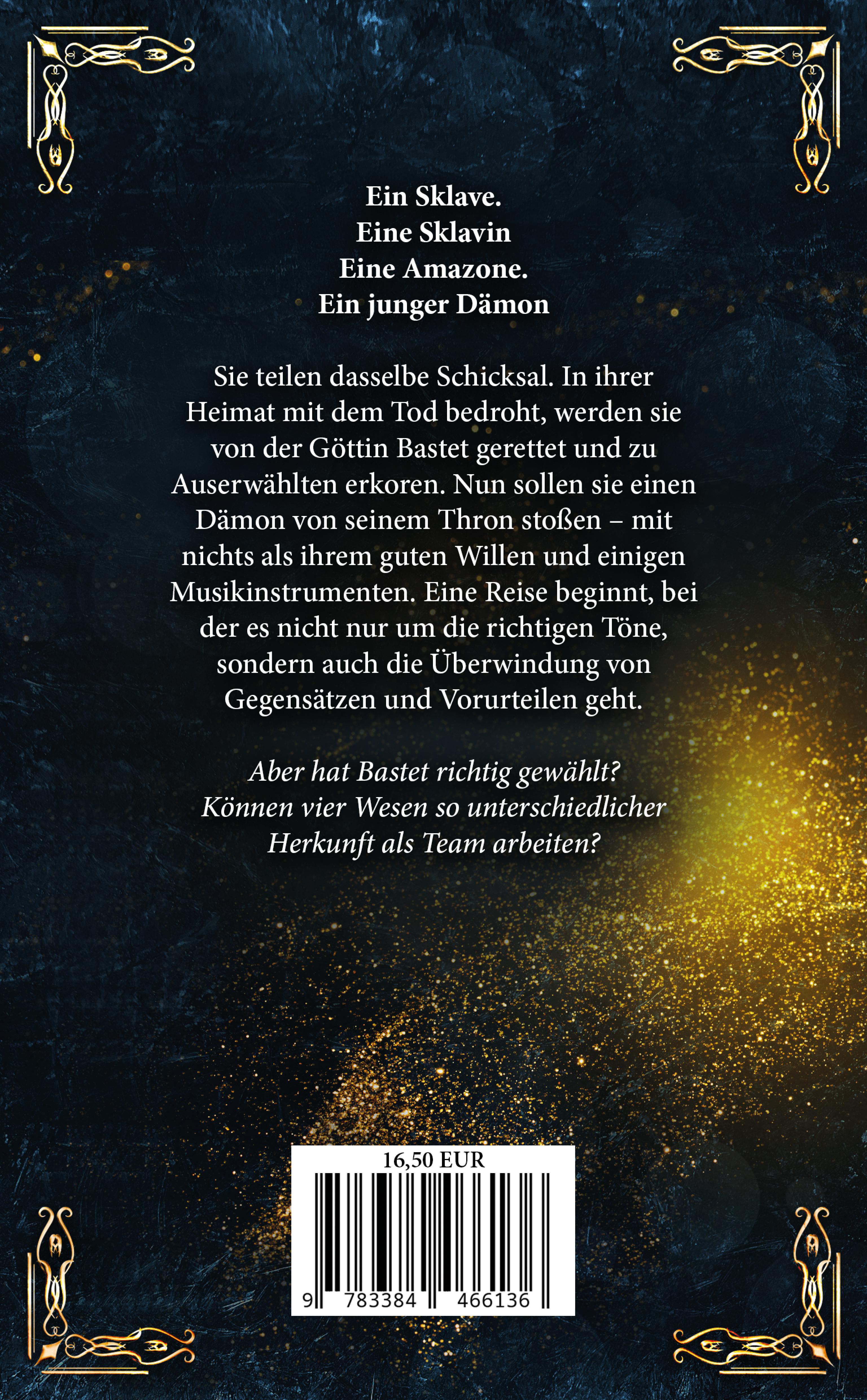 Ein Sklave.Eine Sklavin Eine Amazone.Ein junger DämonSie teilen dasselbe Schicksal. In ihrer Heimat mit dem Tod bedroht, werden sie von der Göttin Bastet gerettet und zu Auserwählten erkoren. Nun sollen sie einen Dämon von seinem Thron stoßen - mit nichts als ihrem guten Willen und einigen Musikinstrumenten.Eine Reise beginnt, bei der es nicht nur um die richtigen Töne, sondern auch die Überwindung von Gegensätzen und Vorurteilen geht. Aber hat Bastet richtig gewählt? Können vier Wesen so unterschiedlicher Herkunft als Team arbeiten?