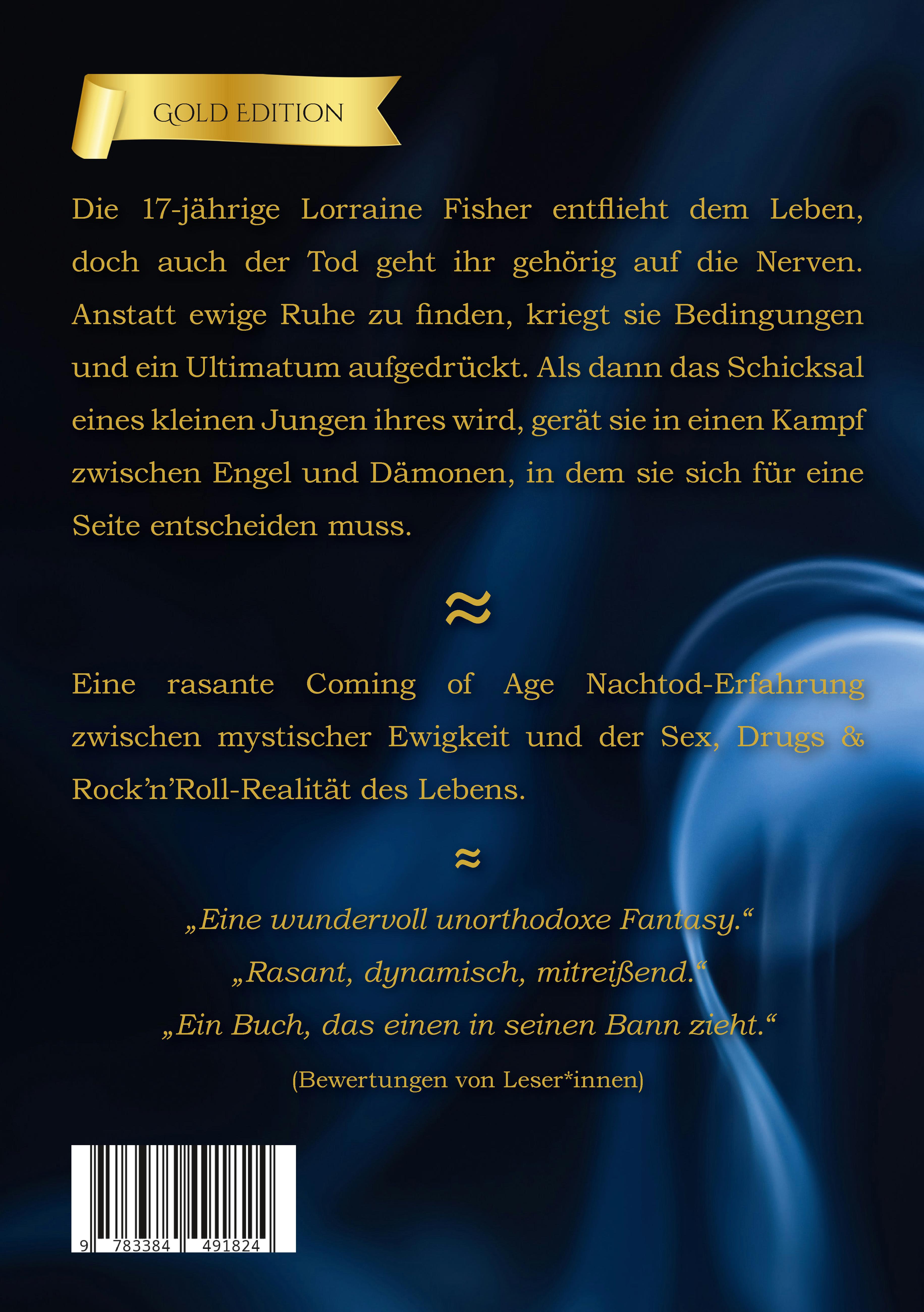 Die 17-jährige Lorraine Fisher ist tot. Dennoch geht ihre Geschichte weiter. Dabei wollte sie doch nur ihre Ruhe haben. Was wollen nur alle von ihr? Plötzlich kriegt sie Bedingungen und ein Ultimatum aufgedrückt, Engel und Dämonen sind gleichermaßen hinter ihr her und laufend spürt sie diesen eigenartigen Sog in die Dunkelheit. Der Nach-Tod geht ihr schnell gehörig auf die Nerven. Sie beschließt zu fliehen und fordert damit unweigerlich das Schicksal heraus. Vorsicht, dieses Buch hat es in sich!Eine rasante Teenage-Nach-Tod-Erfahrung zwischen mystischer Ewigkeit und der Sex-Drugs-Rock'n'Roll-Realität des Lebens. Eine fesselnde Dark-Fantasy Kreation, die Ihr lieben werdet!Diese Geschichte ist so direkt, heftig und ungeschönt wie das Leben nun mal ist. Lorraine nimmt kein Blatt vor den Mund und lässt sich von niemanden etwas sagen. Sie kämpft ihren eigenen Kampf, aber das Schicksal hat offensichtlich andere Pläne mit ihr. Ein Buch über das, was in einem steckt: der Ärger, die Ängste, die Unsicherheit genauso wie Mut und Stärke. Wir erschaffen im Leben unsere eigene Realität und das zeigt Lorraine auf schonungslose Art und mit direkter Sprache. Schließlich ist auch das Leben voller Turbulenzen. Und natürlich geht es um die Sehnsucht nach Dunkelheit, seelenwärmende Melancholie, Verbotenes, Tabus, psychodelischen Teenage-Sex, genauso wie zornig, vierliebt, verwirrt und ahnungslos zu sein, bis man auf sein Innerstes hört und seinen Weg findet.Viel Spaß beim Lesen!Benedict ErnstFollow me on Instagram: @der_benedict_ernst