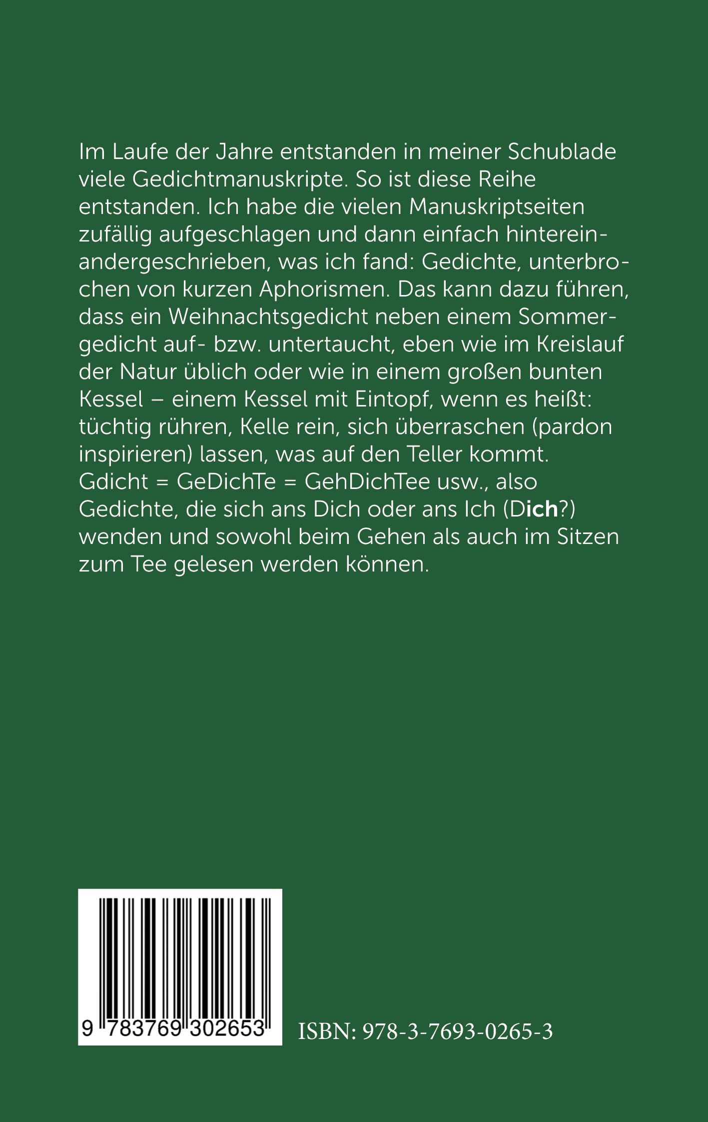 Gdicht. GeDichTe. GehDichTee. Also Gedichte, die sich ans Dich oder ans Ich wenden und sowohl beim Gehen als auch im Sitzen zum Tee gelesen werden können.