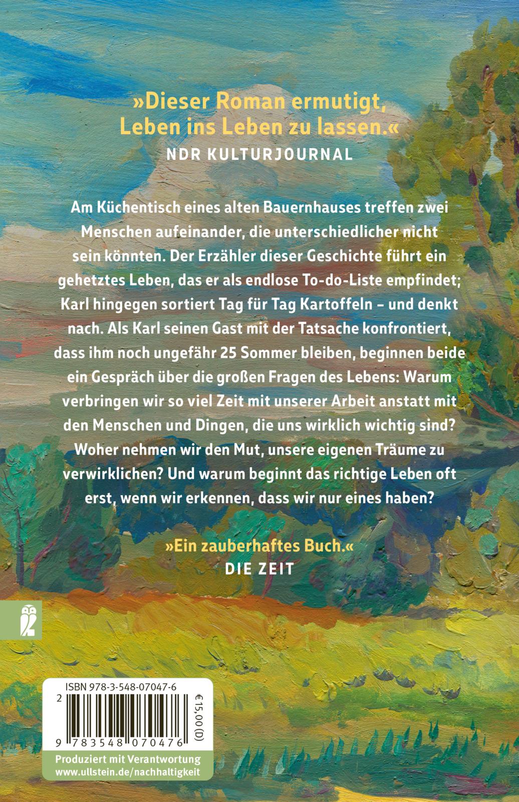 Am Küchentisch eines alten Bauernhauses treffen zwei Menschen aufeinander, die unterschiedlicher nicht sein könnten. Der Erzähler dieser Geschichte führt ein gehetztes Leben, das er als endlose To-do-Liste empfindet; Karl hingegen sortiert Tag für Tag Kartoffeln - und denkt nach. Als Karl seinen Gast mit der Tatsache konfrontiert, dass ihm noch ungefähr 25 Sommer bleiben, beginnen beide ein Gespräch über die großen Fragen des Lebens: Warum verbringen wir so viel Zeit mit unserer Arbeit anstatt mit den Menschen und Dingen, die uns wirklich wichtig sind? Woher nehmen wir den Mut, unsere eigenen Träume zu verwirklichen? Und warum beginnt das richtige Leben oft erst, wenn wir erkennen, dass wir nur eines haben?