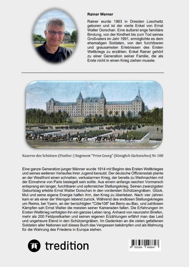 | Schlagworte | Chemin des Dames • Dinant in Belgien • Dresden 1914-1918 • Erster Weltkrieg • Höhe 108 Berry-au-Bac • La Ville-aux-Bois • Militärgeschichte • Reims 1914-1918 • Sächsische Geschichte • Schützen-(Füsilier-)Regiment "Prinz Georg" (Königlich Sächsisches) Nr. 108 • Stellungskrieg in Frankreich |