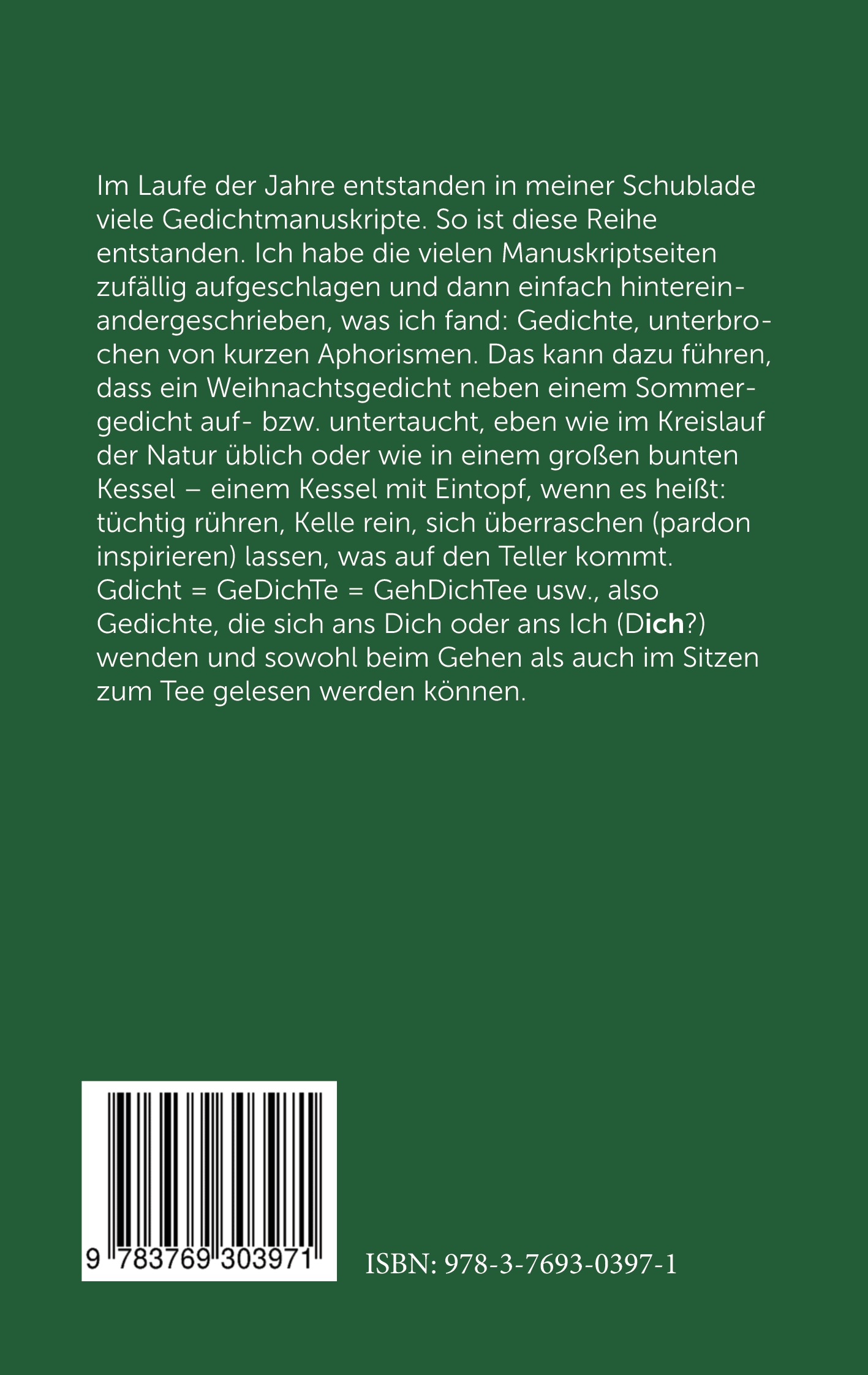 So ist diese Reihe entstanden. Ich habe die vielen Manuskriptseiten zufällig aufgeschlagen und dann einfach hintereinandergeschrieben, was ich fand: Gedichte, unterbrochen von kurzen Aphorismen. Das kann dazu führen, dass ein Weihnachtsgedicht neben einem Sommergedicht auftaucht, eben wie im Kreislauf der Natur üblich oder wie in einem großen bunten Kessel, einem Kessel mit Eintopf, wenn es heißt: tüchtig rühren, Kelle rein, sich überraschen und inspirieren zu lassen, was auf den Teller kommt.