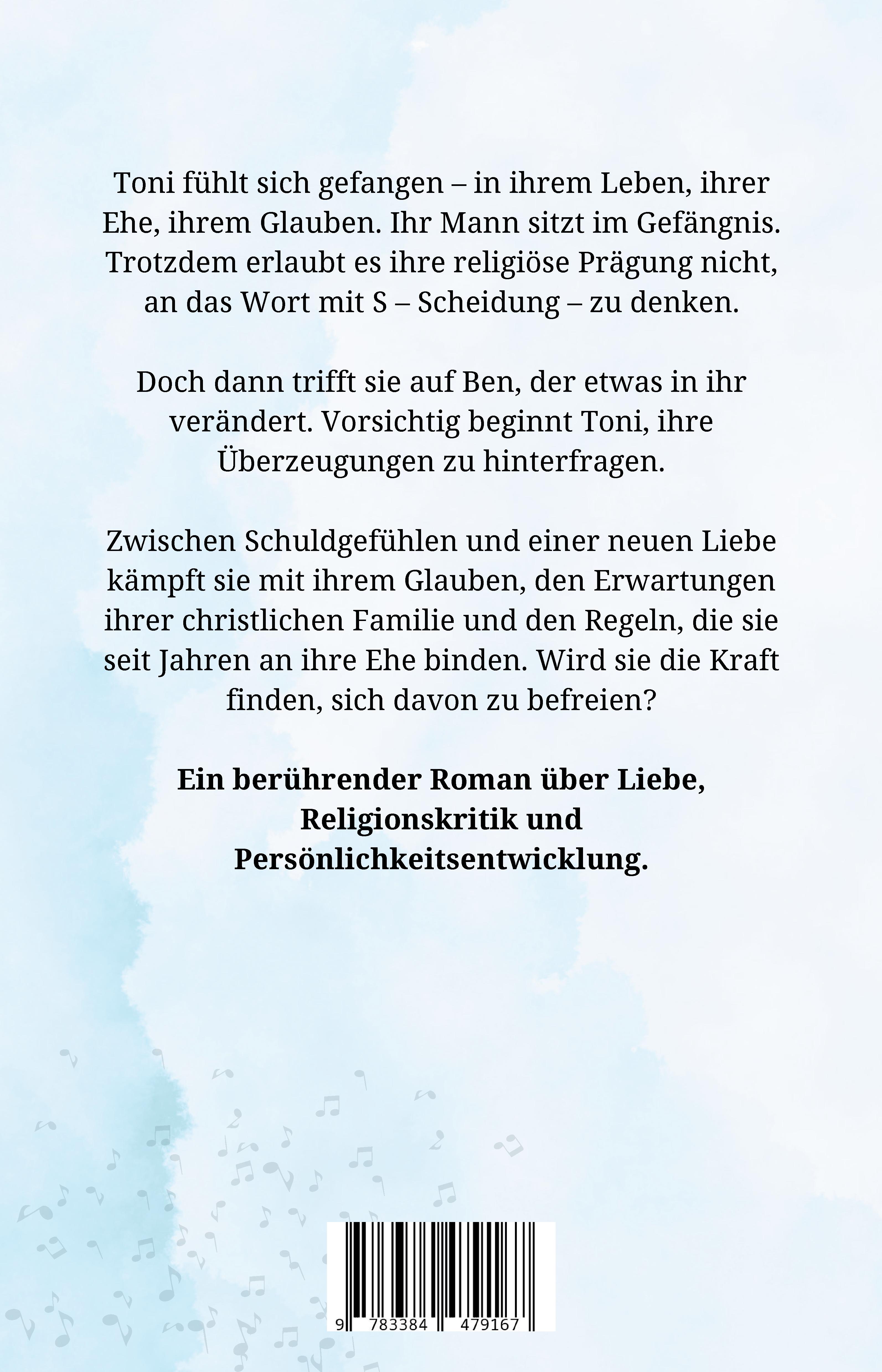 Toni fühlt sich gefangen - in ihrem Leben, ihrer Ehe, ihrem Glauben. Ihr Mann sitzt im Gefängnis. Trotzdem erlaubt es ihre religiöse Prägung nicht, an das Wort mit S - Scheidung - zu denken. Doch dann trifft sie auf Ben, der etwas in ihr verändert. Vorsichtig beginnt Toni, ihre Überzeugungen zu hinterfragen. Zwischen Schuldgefühlen und einer neuen Liebe kämpft sie mit ihrem Glauben, den Erwartungen ihrer christlichen Familie und den Regeln, die sie seit Jahren an ihre Ehe binden. Wird sie die Kraft finden, sich davon zu befreien? Ein berührender Roman über Liebe, Religionskritik und Persönlichkeitsentwicklung.