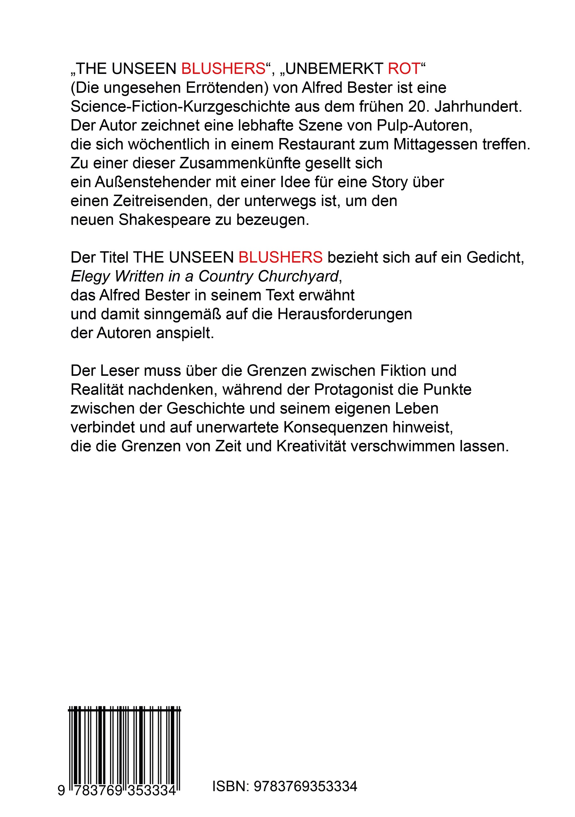 The Unseen Blushers, Unbemerkt Rot, von Alfred Bester ist eine Science-Fiction-Kurzgeschichte aus dem frühen 20. Jahrhundert. Der Autor zeichnet eine lebhafte Szene von Pulp-Autoren, die sich wöchentlich in einem Restaurant zum Mittagessen treffen.