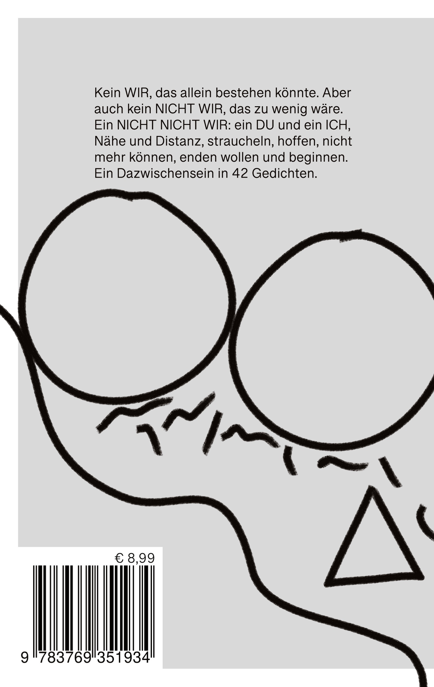 Kein WIR, das allein bestehen könnte. Aber auch kein NICHT WIR, das zu wenig wäre. Ein NICHT NICHT WIR: ein DU und ein ICH, Nähe und Distanz, straucheln, hoffen, nicht mehr können, enden wollen und beginnen. Ein Dazwischensein in 42 Gedichten.