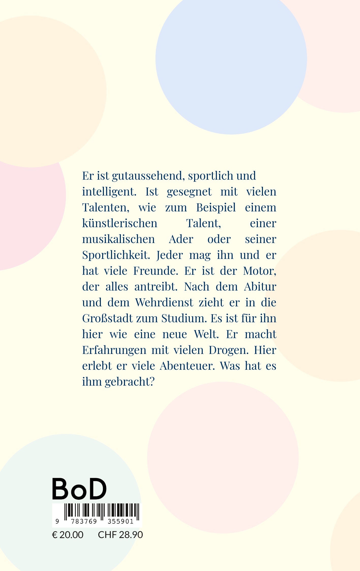 Er ist gutaussehend, sportlich und intelligent. Ist gesegnet mit vielen Talenten, wie zum Beispiel einem künstlerischen Talent, einer musikalischen Ader oder seiner Sportlichkeit. Jeder mag ihn und er hat viele Freunde. Er ist der Motor, der alles antreibt. Nach dem Abitur und dem Wehrdienst zieht er in die Großstadt zum Studium. Es ist für ihn hier wie eine neue Welt. Er macht Erfahrungen mit vielen Drogen. Hier erlebt er viele Abenteuer. Was hat es ihm gebracht?