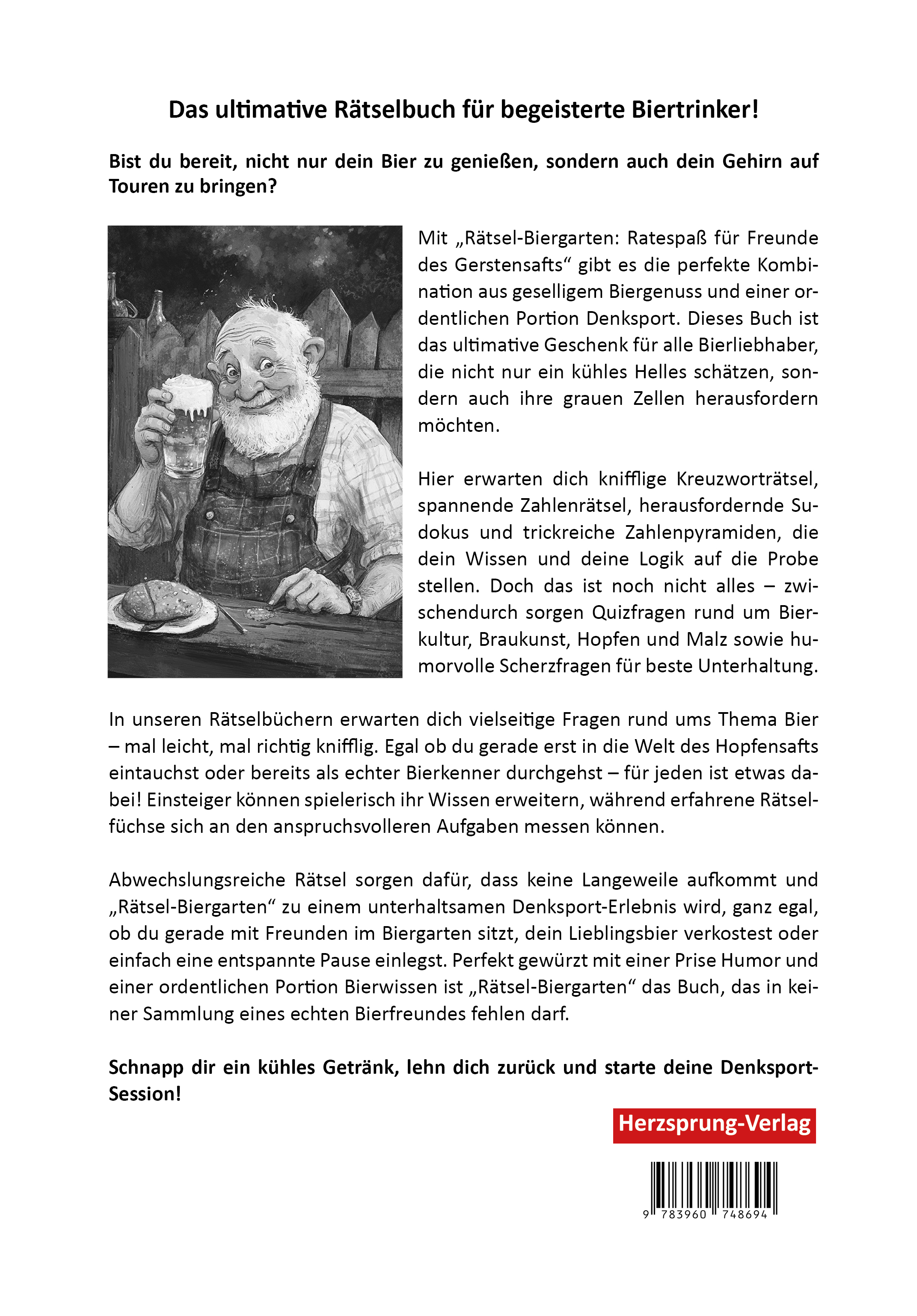 Abwechslungsreiche Rätsel sorgen dafür, dass keine Langeweile aufkommt und „Rätsel-Biergarten“ zu einem unterhaltsamen Denksport-Erlebnis wird, ganz egal, ob du gerade mit Freunden im Biergarten sitzt, dein Lieblingsbier verkostest oder einfach eine entspannte Pause einlegst. Perfekt gewürzt mit einer Prise Humor und einer ordentlichen Portion Bierwissen ist „Rätsel-Biergarten“ das Buch, das in keiner Sammlung eines echten Bierfreundes fehlen darf.