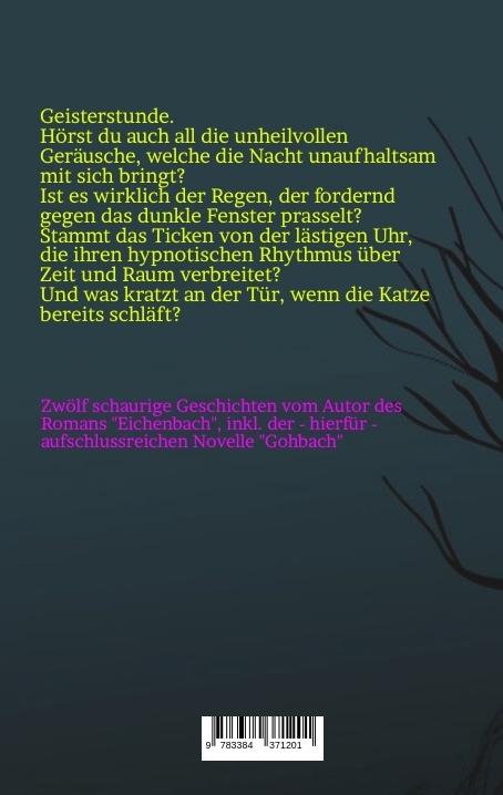 Zwölf Kurzgeschichten aus dem Horror-Genre.Der Autor des Romans "Eichenbach" bietet dem Leser mit "Nachtgeräusche" zwölf Geschichten unterschiedlichster Art, welche für schaurig-schöne Gruselstunden sorgen werden.Neben neuen Erzählungen wie "Felix", "Die Scheuche" , "Ich komme wieder" und "Wir schenken Leben", ist in diesem Buch die Novelle "Gohbach" enthalten, welche direkt auf die Geschehnisse des Romans "Eichenbach" anspielt." Schleichender" Horror aus Niedersachsen - auch für zartbesaitete geeignet!