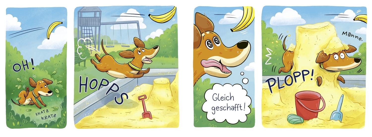 Was passiert, wenn ein hungriger Dackel eine fliegende Banane entdeckt? Chaos pur natürlich! Begleite den Dackel auf seiner turbulenten Verfolgungsjagd quer durch den Park – voller Pfützen, Spielplatzabenteuer und überraschender Wendungen. Dieses witzige Pappbilderbuch bringt den Comic-Trend jetzt auch zu Kindern ab 2 Jahren. Entwickelt mit Eltern und Kindern aus der Zielgruppe: Jede Menge Lachen und gemeinsamer Lesespaß garantiert!